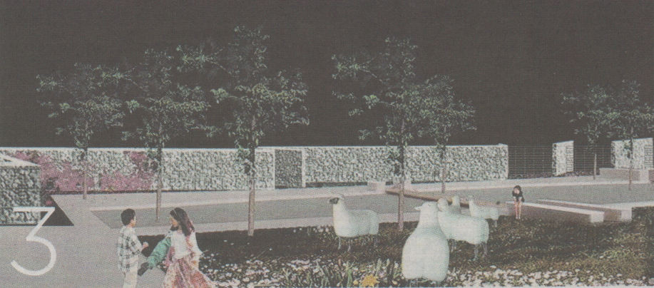 - Ο Κήπος του Ισκιου περιλαμβάνει μια διαμήκη πορεία – πεζόδρομο, εκατέρωθεν της οποίας διαμορφώνονται σημεία στάσης με κτιστά καθιστικά και παράπλευρος δρόμος, χώρος στάθμευσης και νησίδα πρασίνου.