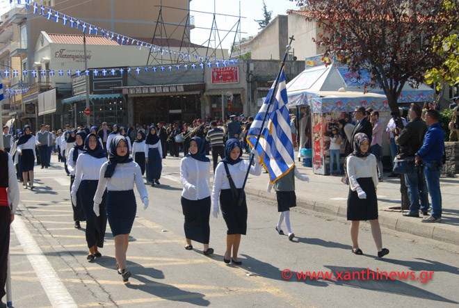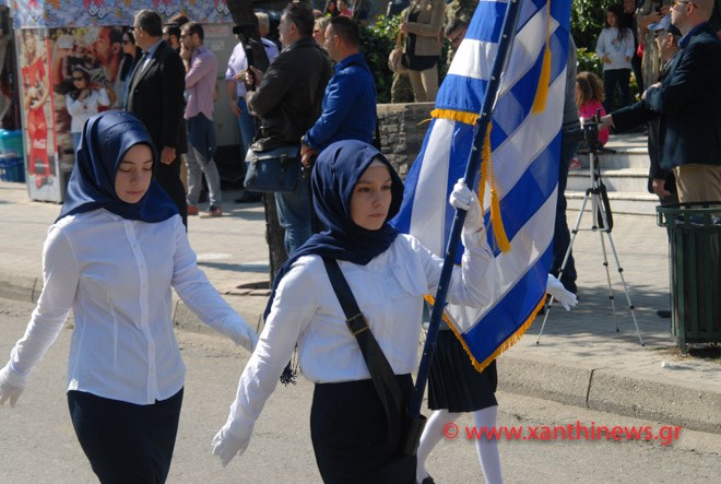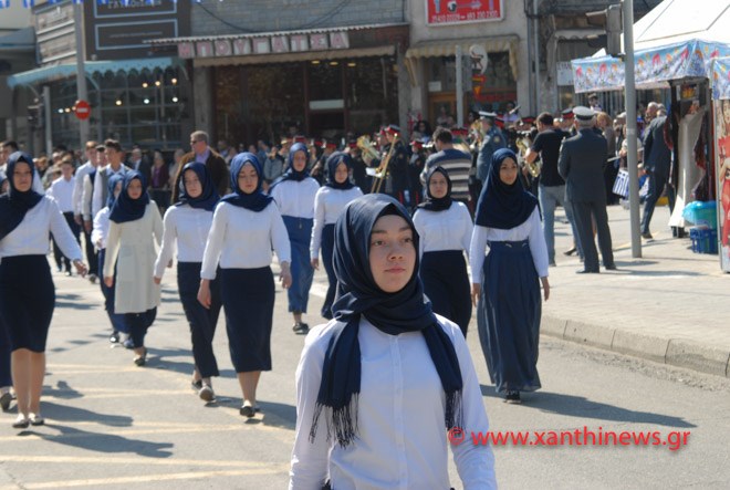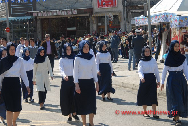 Για πρώτη φορά στην παρέλαση για τον εορτασμό των 98ων Ελευθερίων της Ξάνθης, όλες οι μαθήτριες ενός σχολείου (πιθανότατα του Ιεροσπουδαστήριου) παρέλασαν φορώντας μαντίλα.