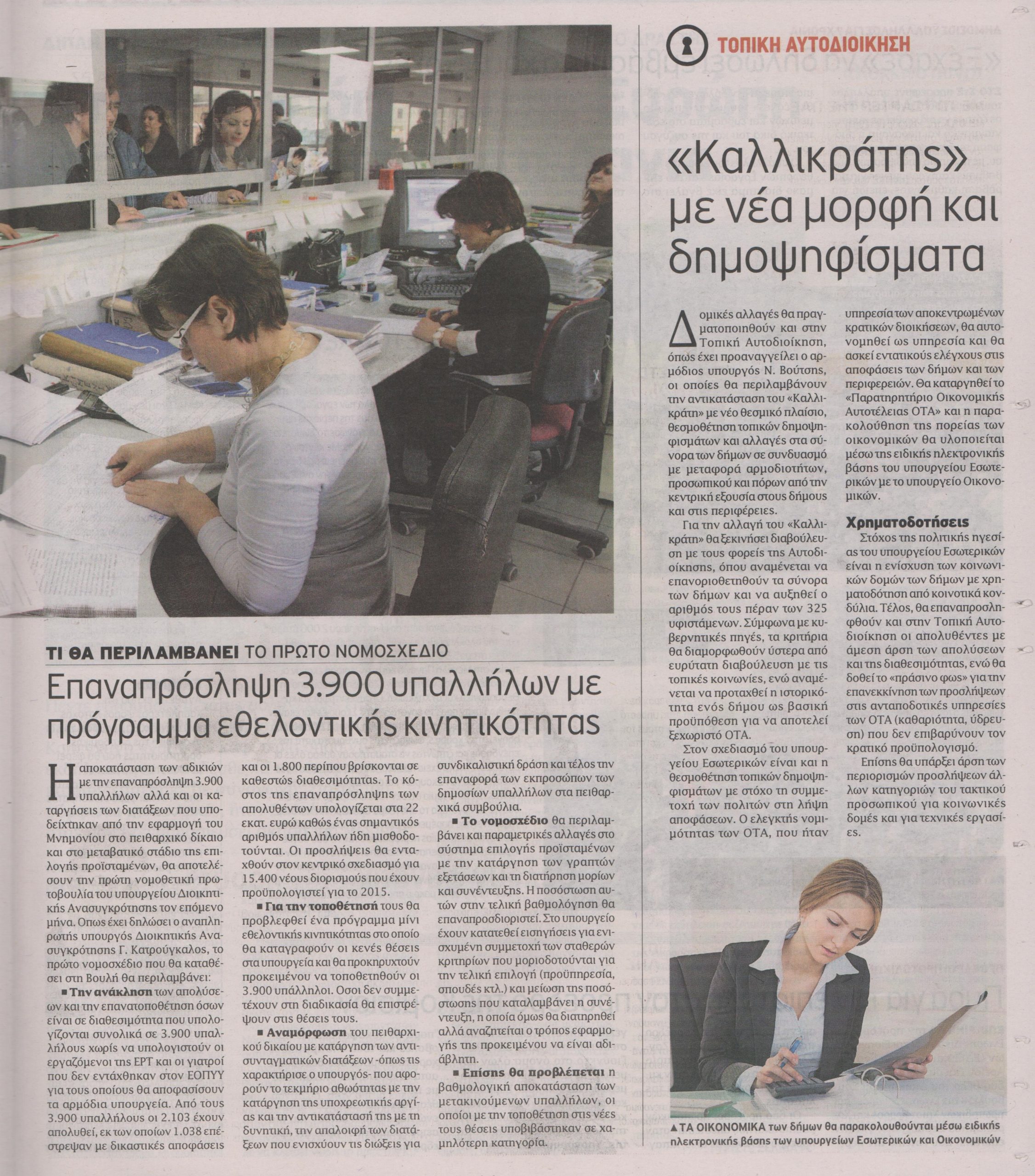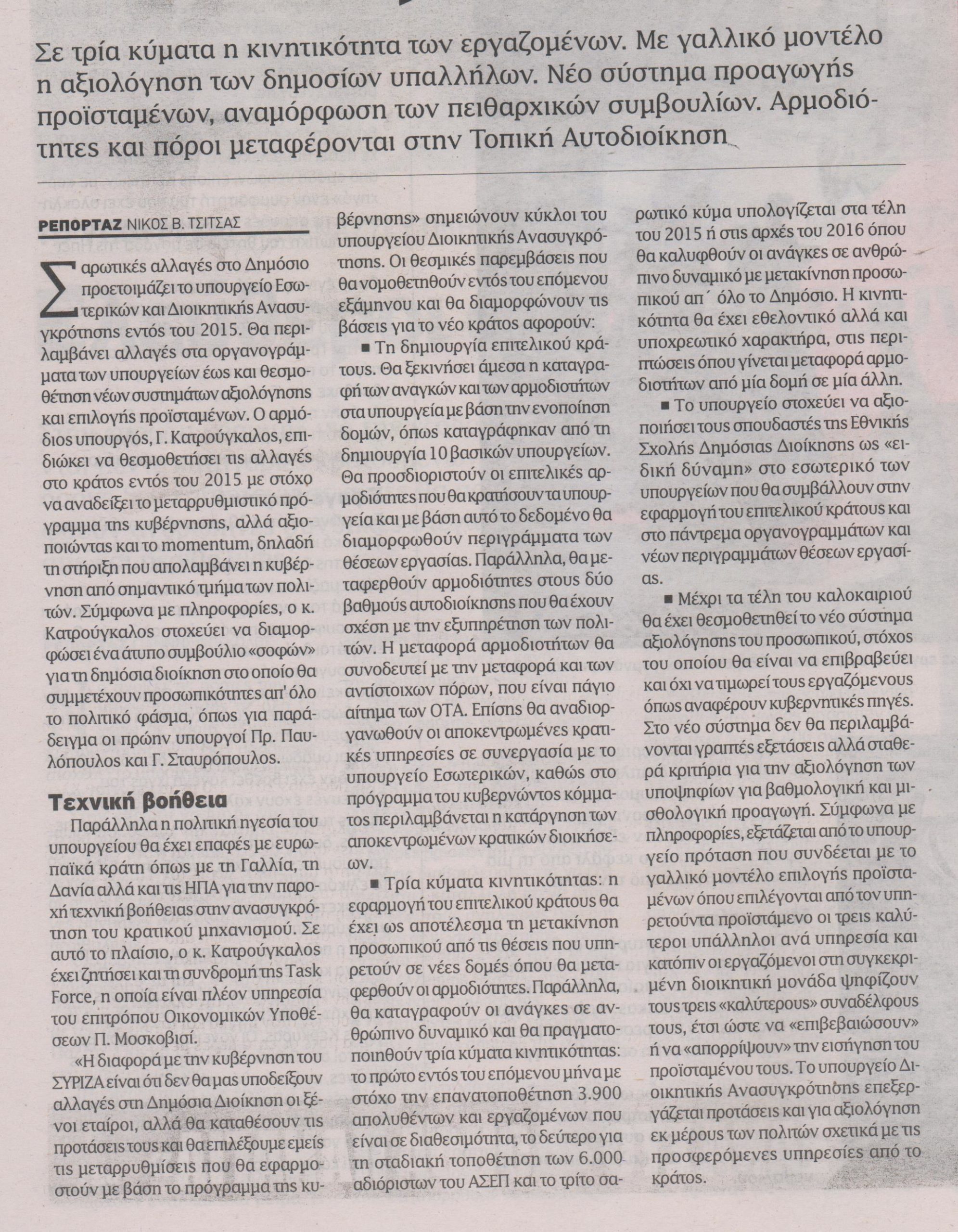 Σαρωτικές αλλαγές στο Δημόσιο προετοιμάζει το υπουργείο Εσωτερικών και Διοικητικής Ανασυγκρότησης εντός του 2015. Θα περιλαμβάνει αλλαγές στα οργανογράμματα των υπουργείων έως και θεσμοθέτηση νέων συστημάτων αξιολόγησης και επιλογής προϊσταμένων.