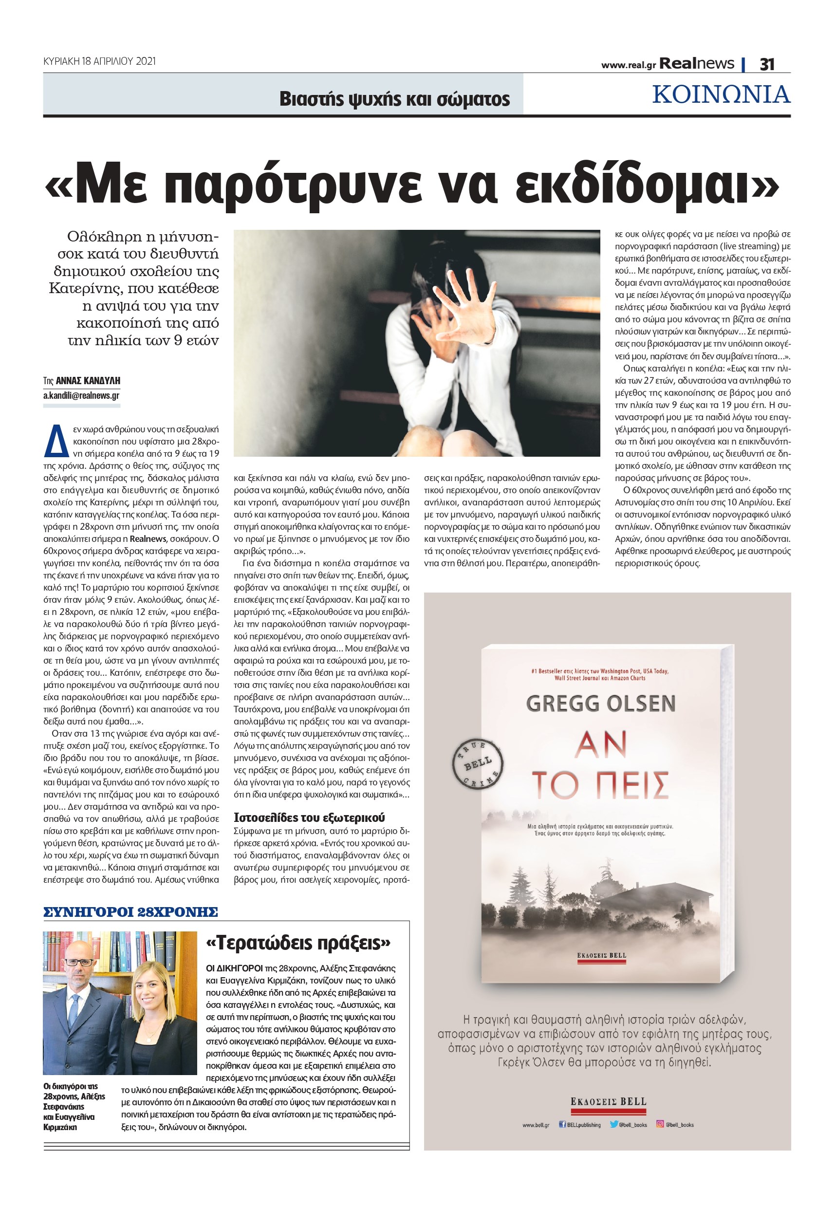 Δεν χωρά ανθρώπου νους τη σεξουαλική κακοποίηση που υφίστατο μια 28χρονη σήμερα κοπέλα από τα 9 έως τα 19 της χρόνια. Δράστης ο θείος της, σύζυγος της αδελφής της μητέρας της, δάσκαλος μάλιστα στο επάγγελμα και διευθυντής σε δημοτικό σχολείο της Κατερίνης, μέχρι τη σύλληψή του, κατόπιν καταγγελίας της κοπέλας. Τα όσα περιγράφει η 28χρονη στη μήνυσή της, την οποία αποκαλύπτει σήμερα η Realnews, σοκάρουν. Ο 60χρονος σήμερα άνδρας κατάφερε να χειραγωγήσει την κοπέλα, πείθοντάς την ότι τα όσα της έκανε ή την υποχρέωνε να κάνει ήταν για το καλό της! Το μαρτύριο του κοριτσιού ξεκίνησε όταν ήταν μόλις 9 ετών. Ακολούθως, όπως λέει η 28χρονη, σε ηλικία 12 ετών, «μου επέβαλε να παρακολουθώ δύο ή τρία βίντεο μεγάλης διάρκειας με πορνογραφικό περιεχόμενο και ο ίδιος κατά τον χρόνο αυτόν απασχολούσε τη θεία μου, ώστε να μη γίνουν αντιληπτές οι δράσεις του… Κατόπιν, επέστρεφε στο δωμάτιο προκειμένου να συζητήσουμε αυτά που είχα παρακολουθήσει και μου παρέδιδε ερωτικό βοήθημα (δονητή) και απαιτούσε να του δείξω αυτά που έμαθα…».
