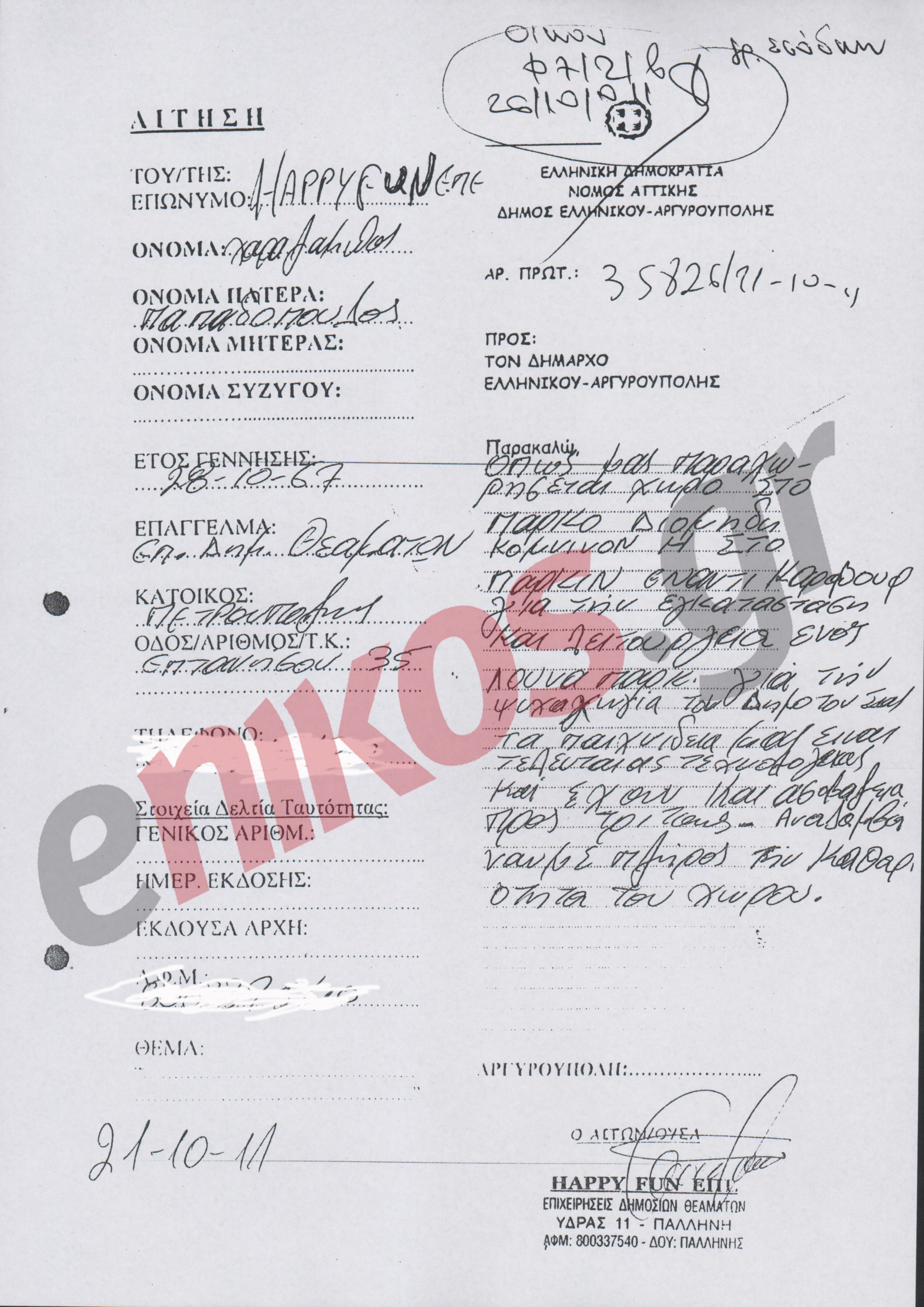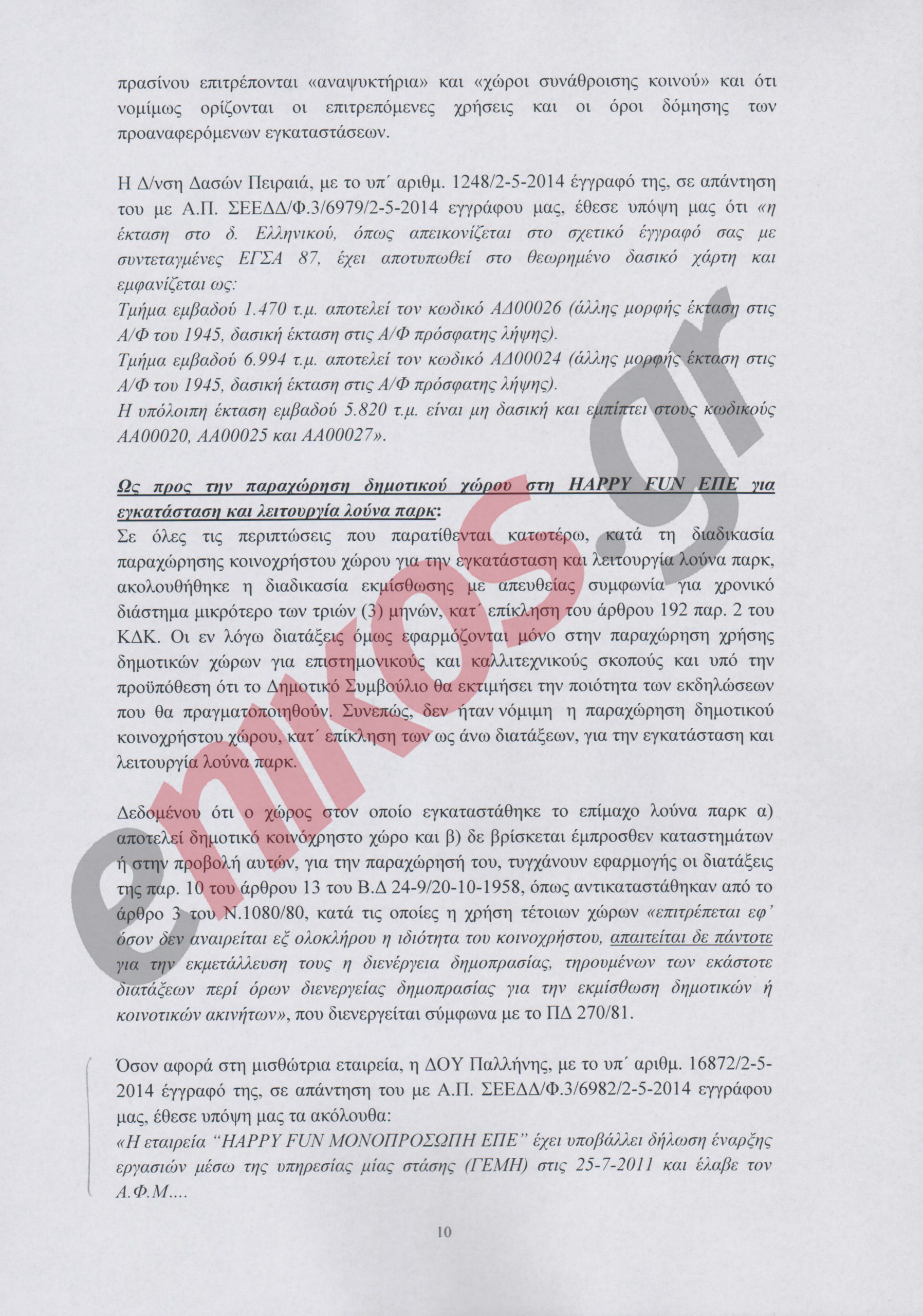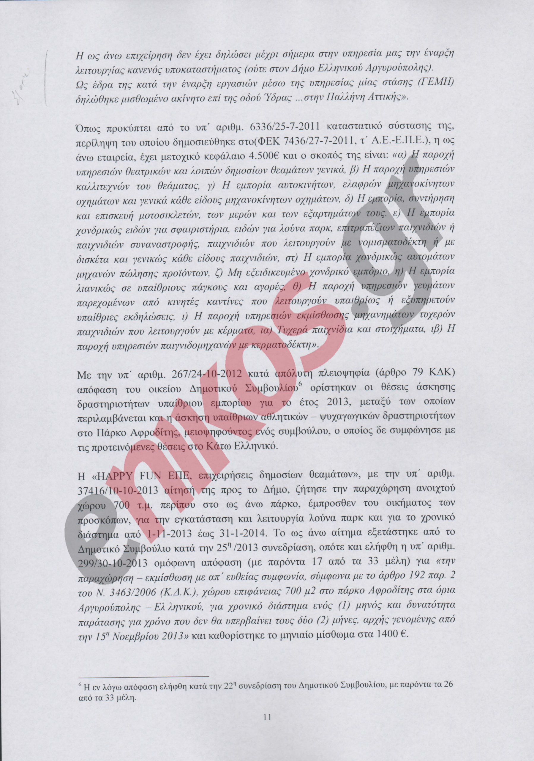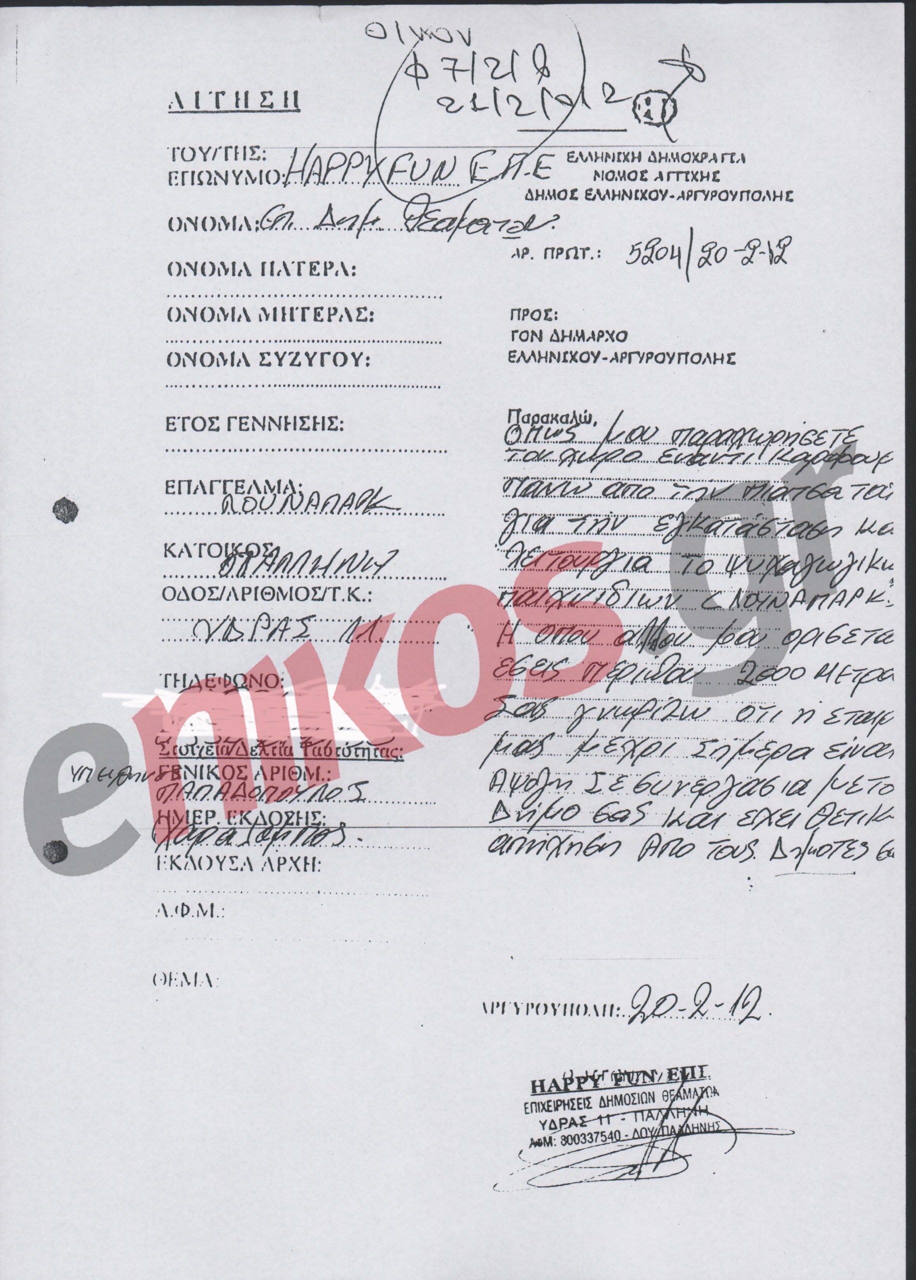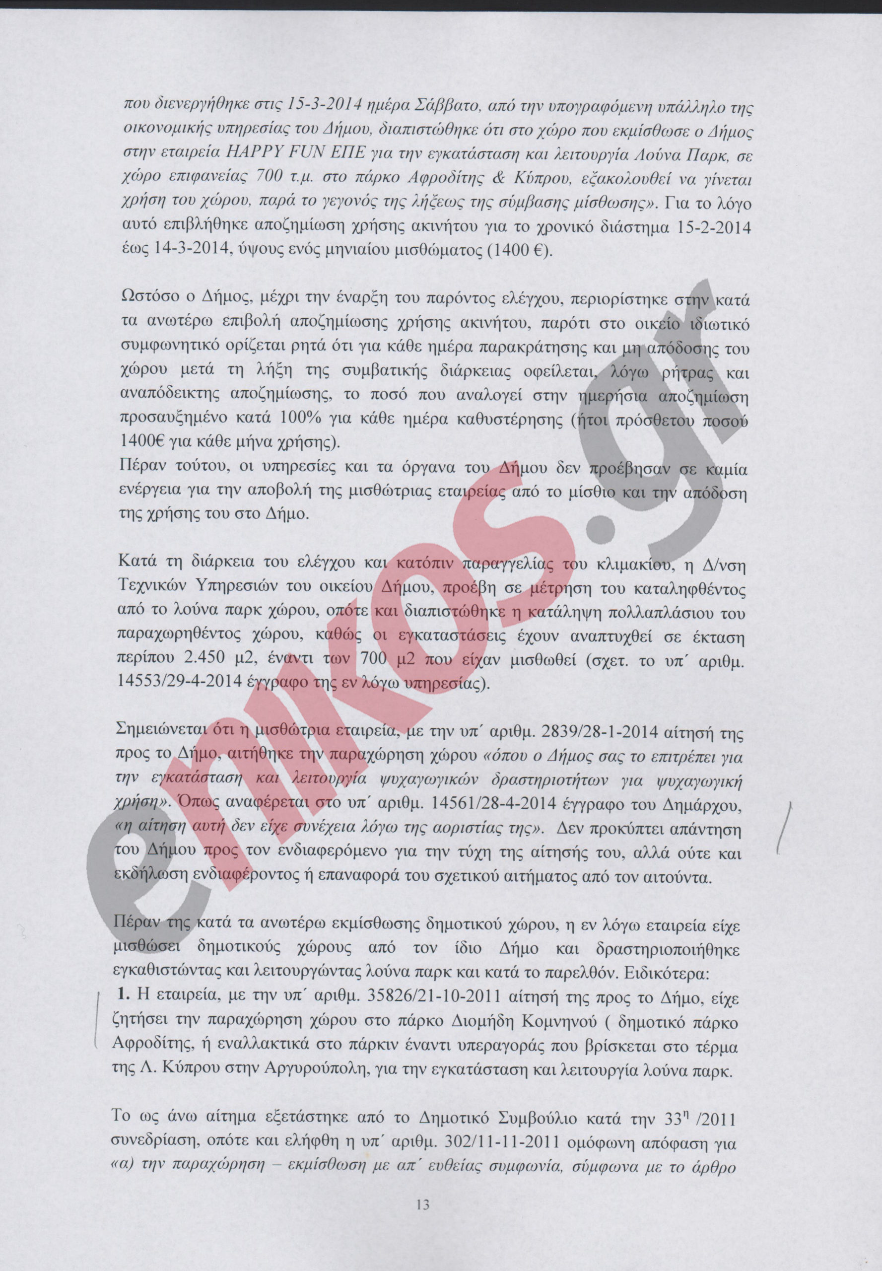 Ειδικότερα, στην αίτηση της Happy Fun ΕΠΕ, στις 20/02/12 για το χώρο στο τέρμα της Λ.Κύπρου, αναφέρεται χαρακτηριστικά: «Σας γνωρίζω ότι η εταιρεία μέχρι σήμερα είναι άψογη σε συνεργασία με το δήμο σας και έχει θετική απήχηση από τους δημότες σας».