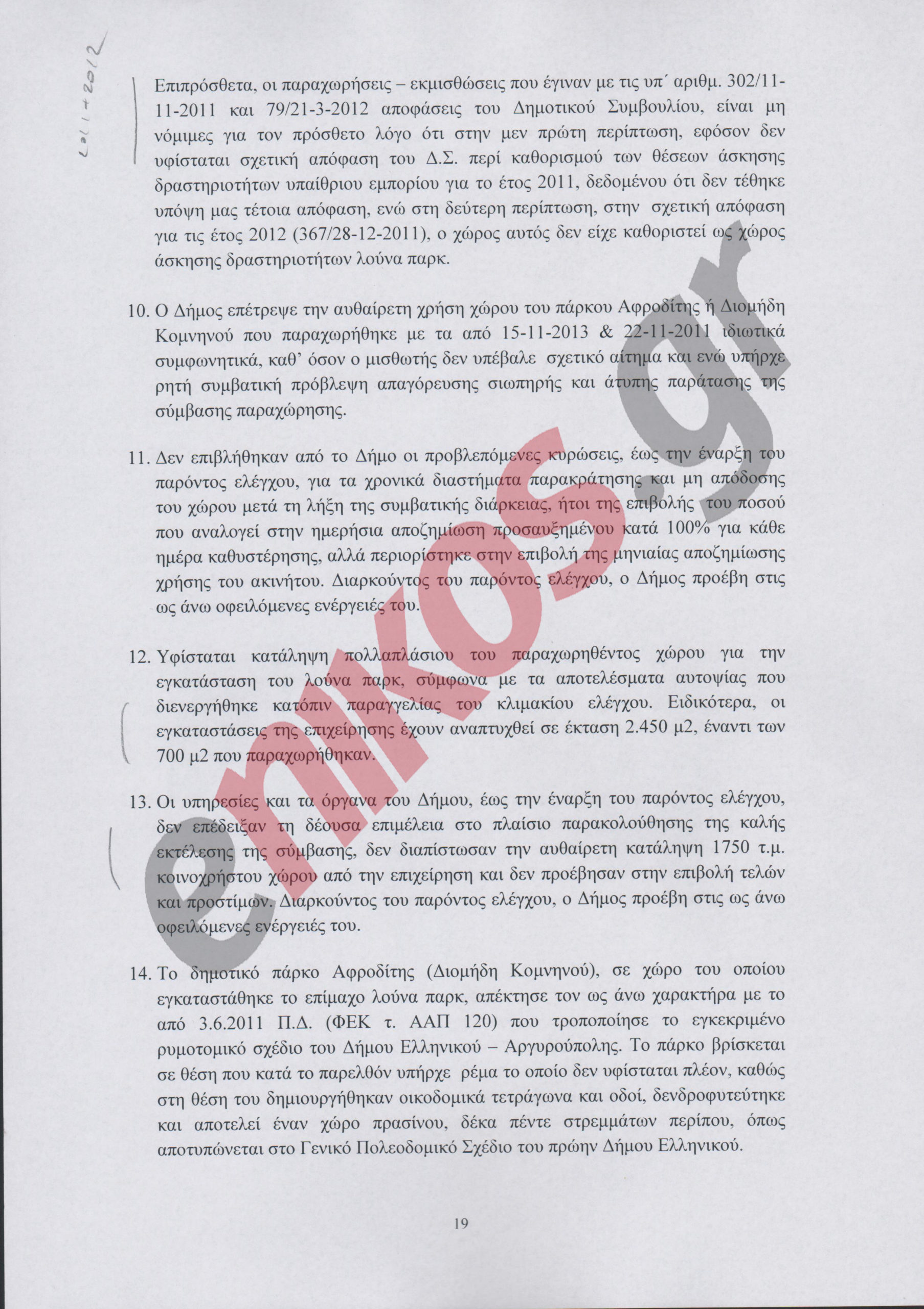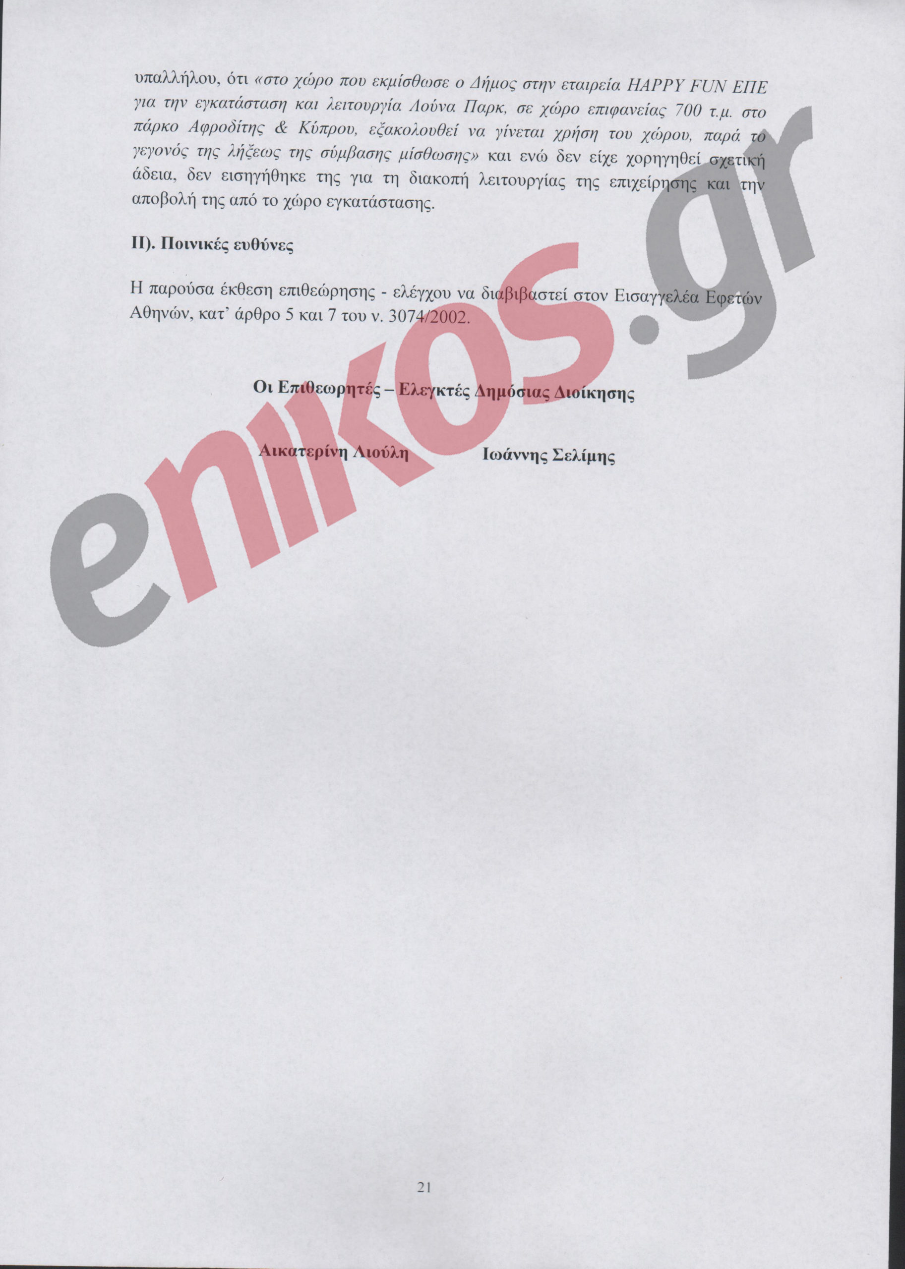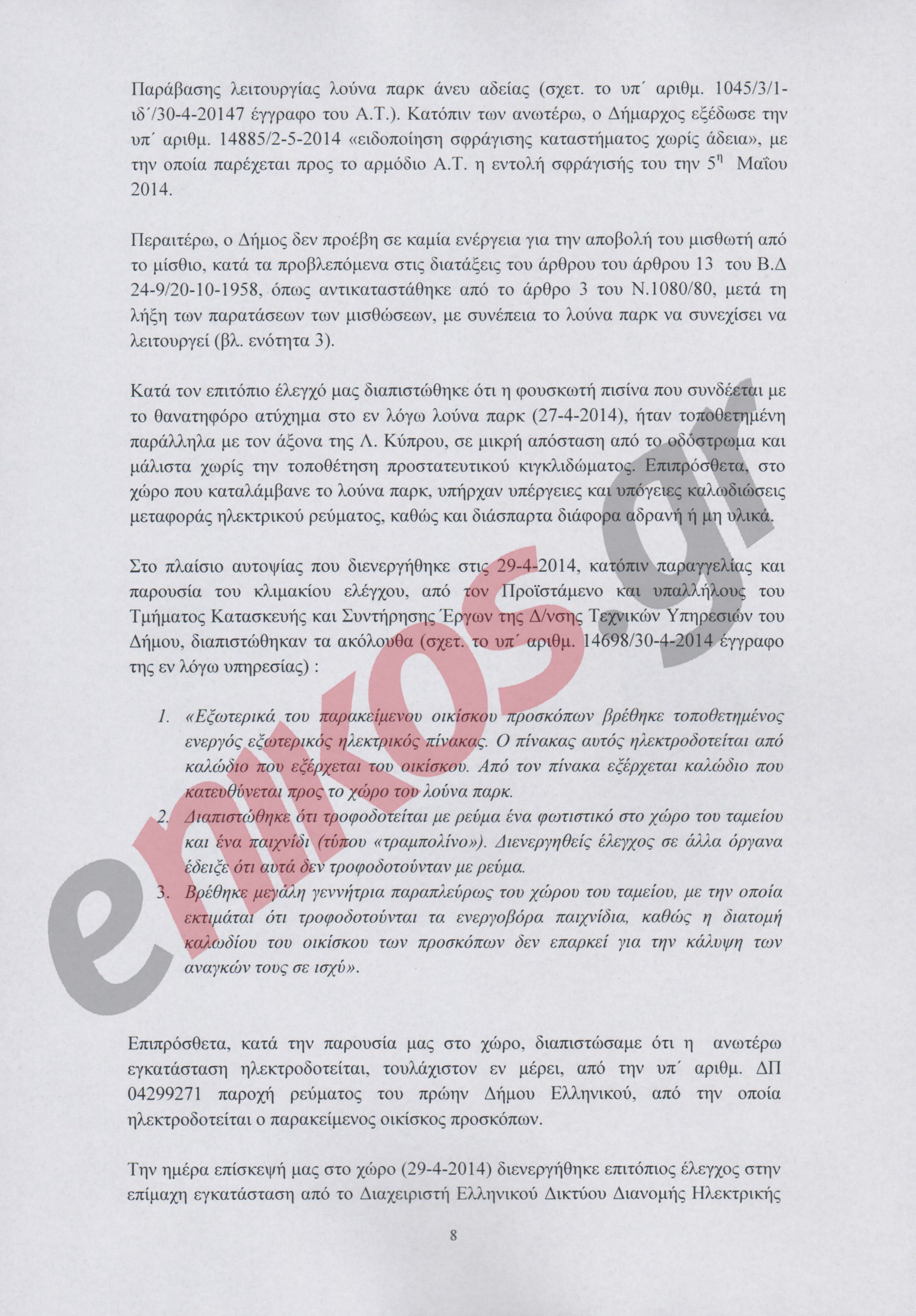 Οι επιθεωρητές καταγράφουν μέσα σε 21 σελίδες όλες τις άγνωστες, μέχρις στιγμής, λεπτομέρειες της υπόθεσης, καταλήγοντας σε διαπιστώσεις και συμπεράσματα που αναδεικνύουν τις αδιανόητες παραλείψεις και τους λανθασμένους χειρισμούς του δημάρχου Ελληνικού Χρήστου Κορτζίδη.