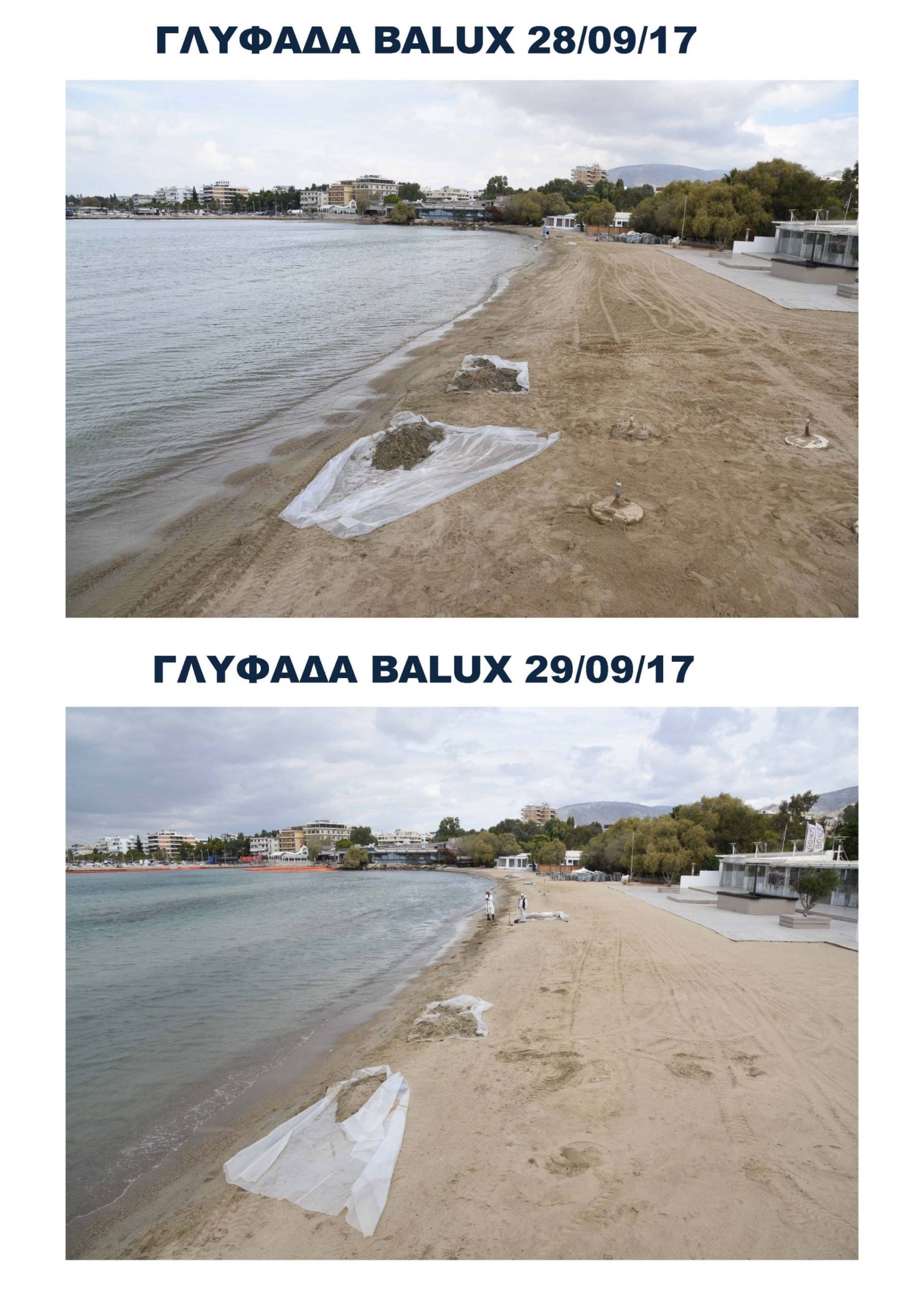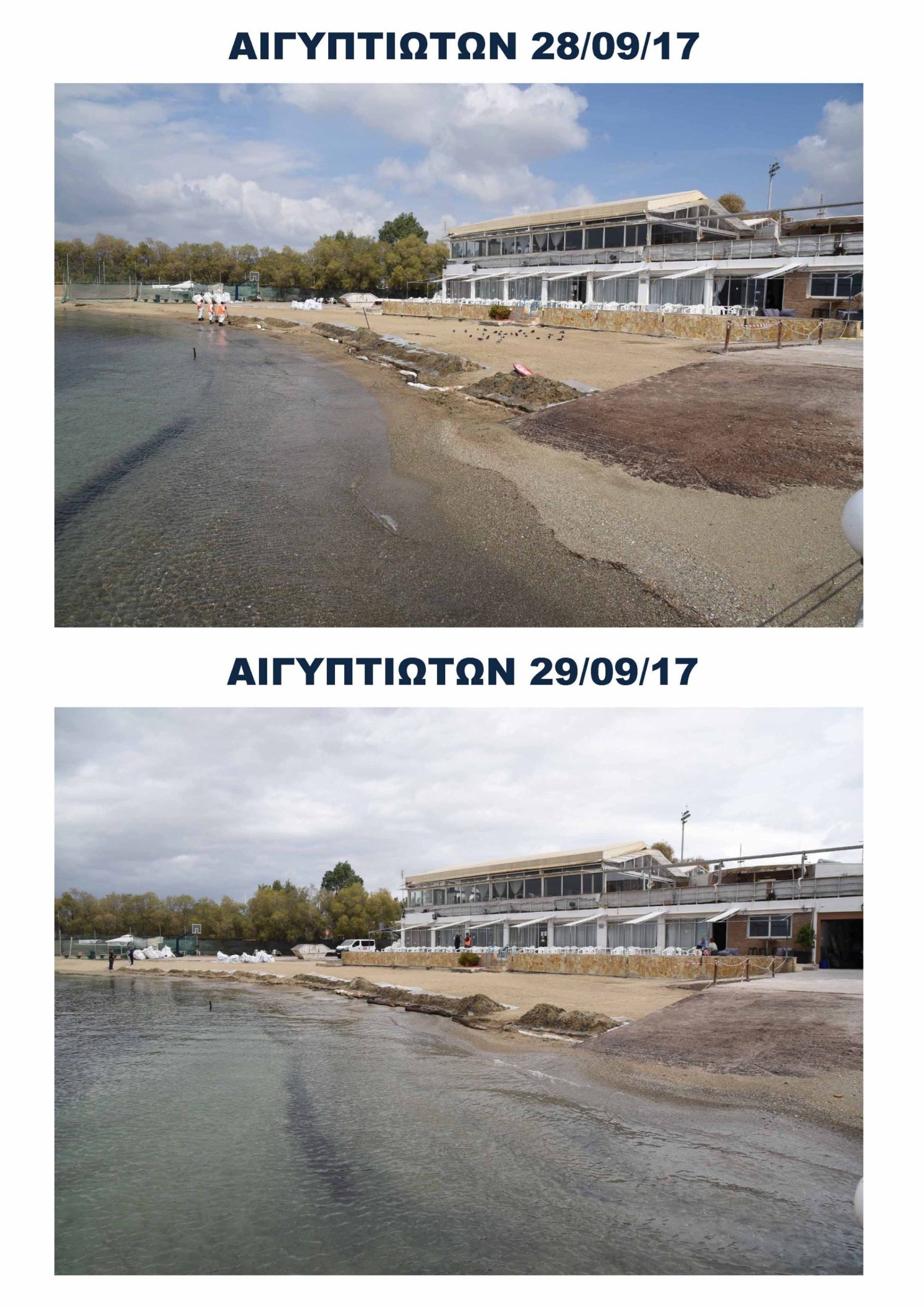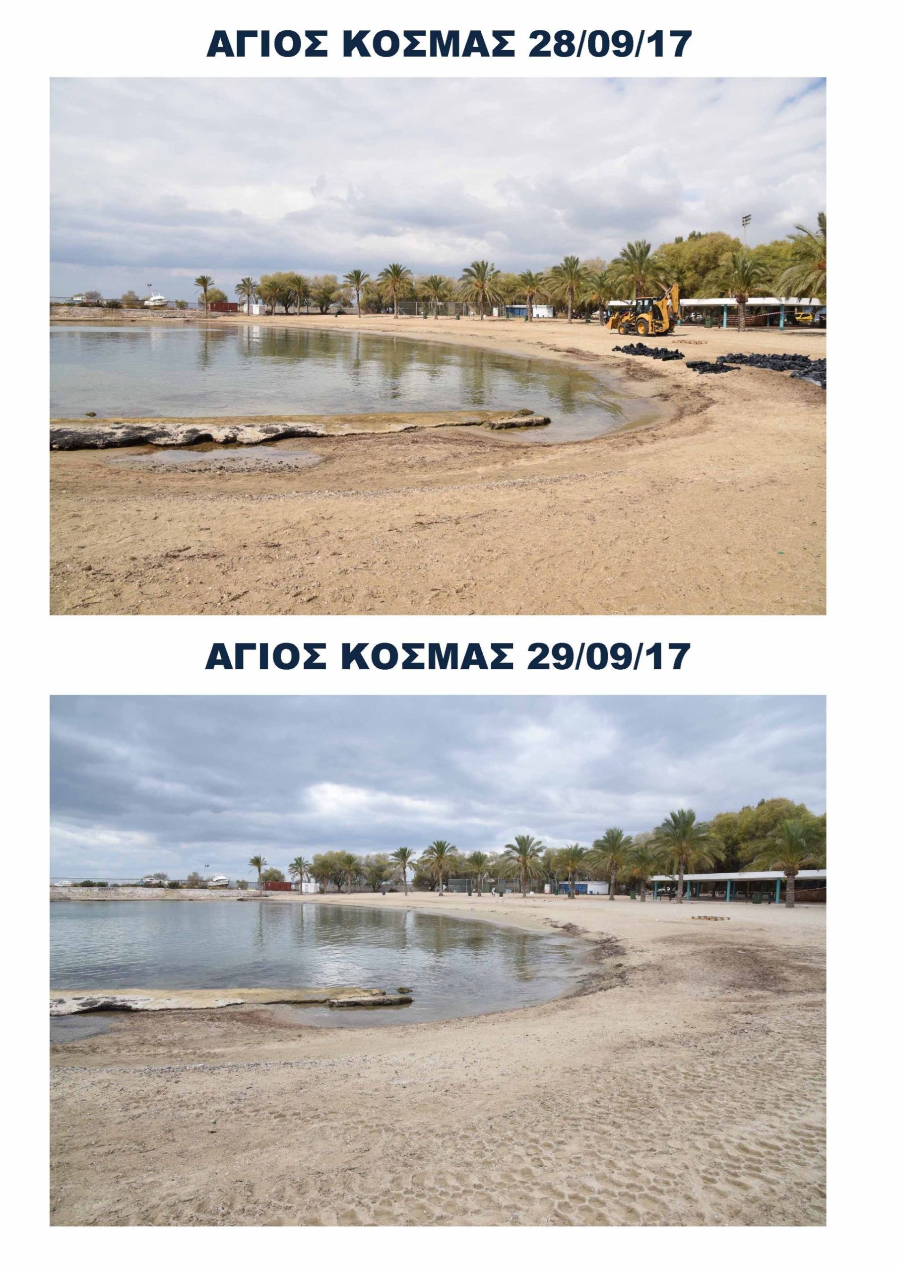Αναφορικά με τη θαλάσσια περιοχή του Αλίμου, στο Α’ και Β’ Αλίπεδο Αλίμου όπου παρατηρείται σημαντική πρόοδος εργασιών, επιχειρεί εντατικά συνεργείο είκοσι (20) ατόμων ιδιωτικής εταιρείας. Μπροστά από τις παραλίες των Δήμων Αλίμου και Ελληνικού (και ειδικότερα της Παλιάς Φαντασίας, του Ελληνικού Ναυτικού Ομίλου Αιγυπτιωτών, του ΕΛΚΕΘΕ, του Αγίου Κοσμά και του Αγίου Αλεξάνδρου), επιχειρούν συνολικά σαράντα οκτώ (48) άτομα ιδιωτικού συνεργείου με πιεστικά μηχανήματα και μπετονιέρα επεξεργασίας άμμου, ενώ η κατάσταση παρουσιάζεται πολύ βελτιωμένη.