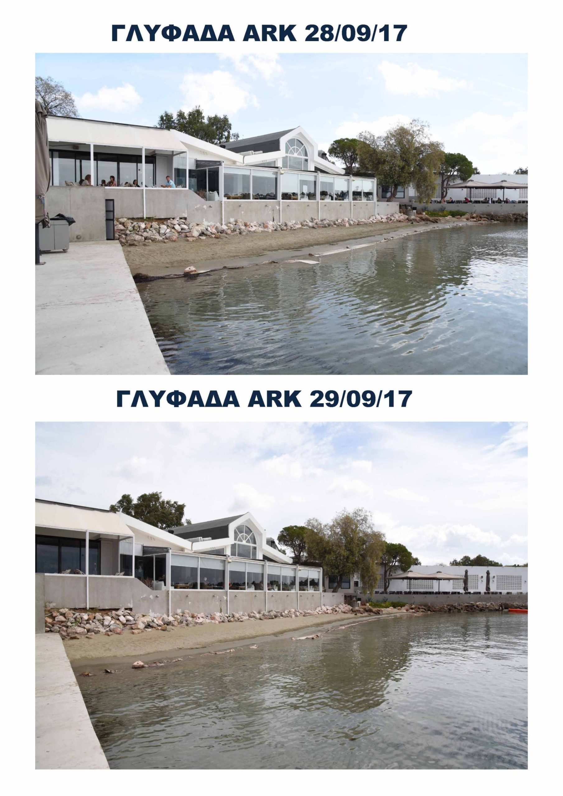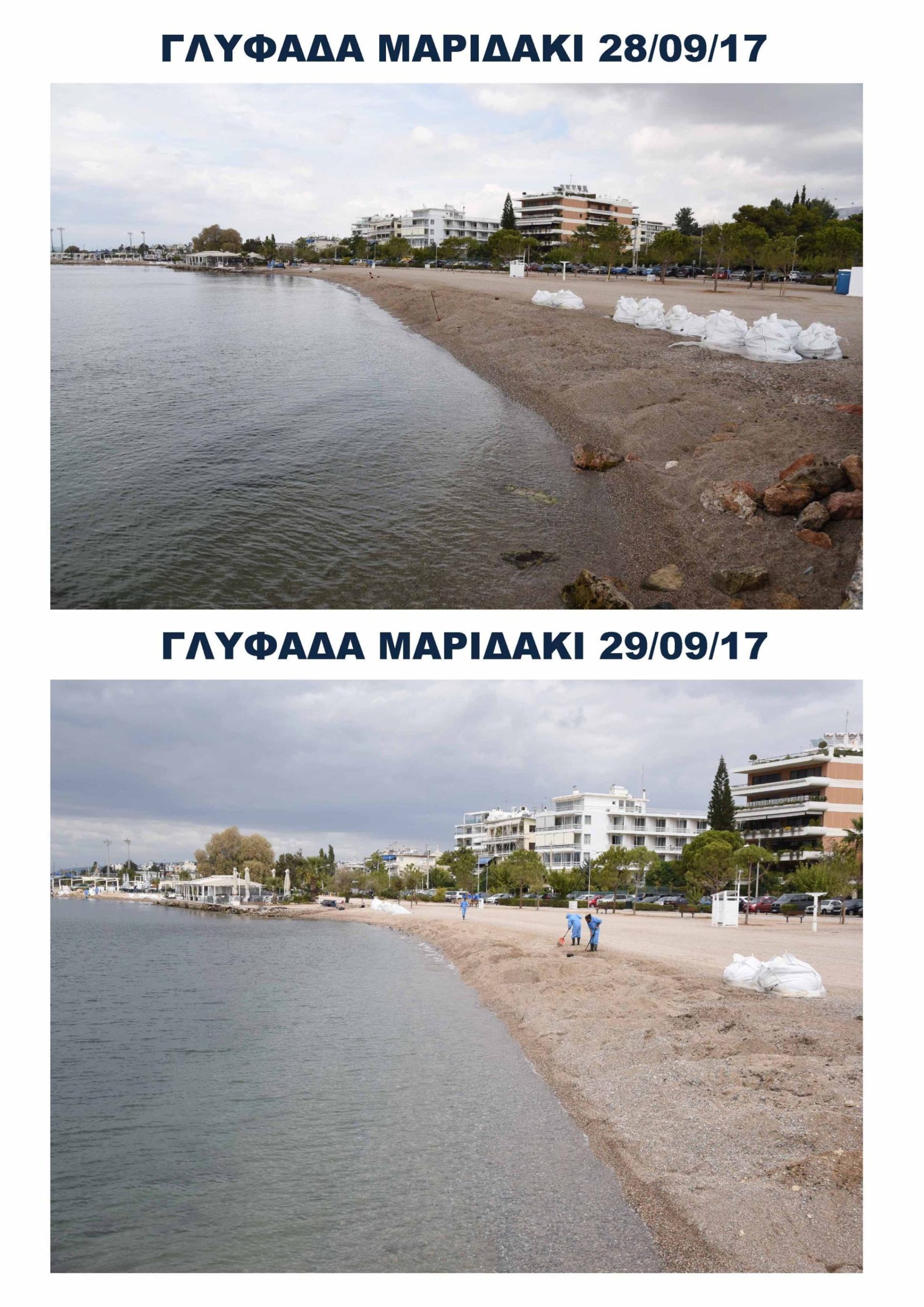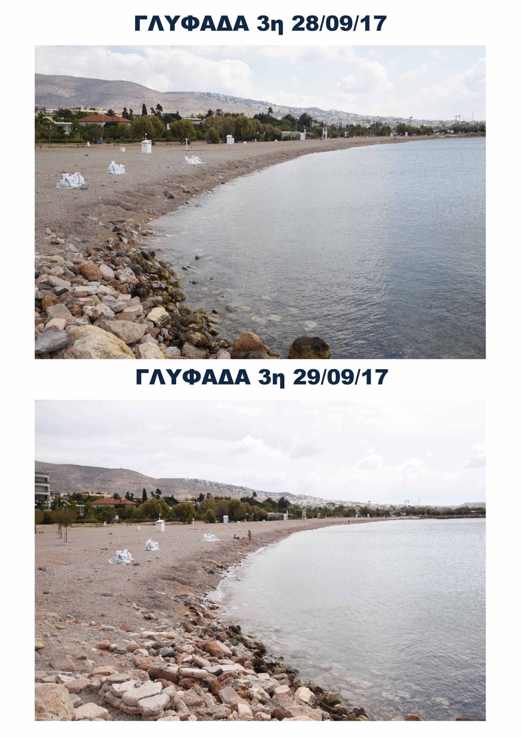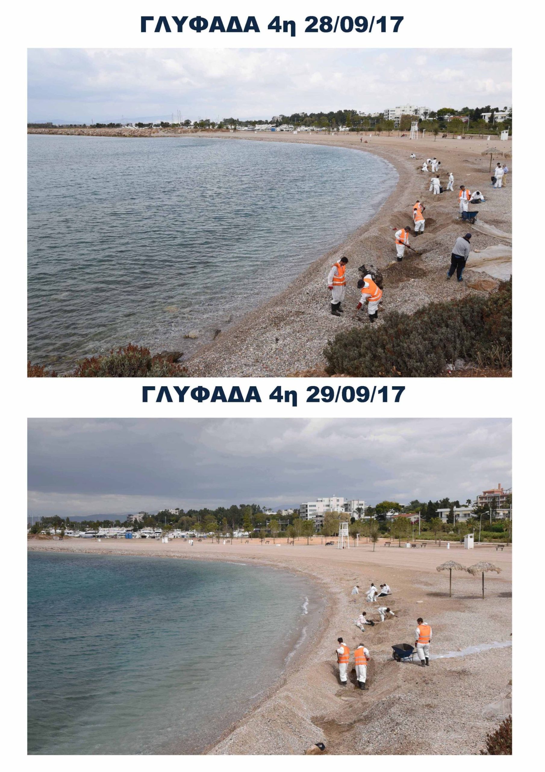 Στη θαλάσσια περιοχή Γλυφάδας (1η-2η-3η-4η μαρίνα) όπου η κατάσταση παρουσιάζεται βελτιωμένη, επιχειρεί συνεργείο, αποτελούμενο από σαράντα εννέα (49) άτομα, μεταξύ των οποίων άτομα της αναδόχου εταιρείας και εθελοντές.