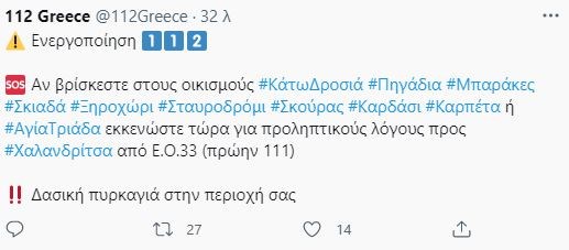 Πριν από λίγο, έλαβαν μήνυμα από το 112 οι κάτοικοι των οικισμών Κάτω Δροσιά, Πηγάδια, Μπαράκες, Σκιαδά, Ξηροχώρι, Σταυροδρόμι, Σκούρας, Καρδάσι, Καρπέτα ή Αγία Τριάδα να εκκενώσουν τα σπίτια τους για προληπτικούς λόγους.