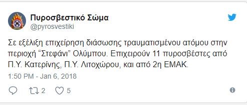 Σύμφωνα με νεότερη ενημέρωση από την Πυροσβεστική, υπάλληλοι της υπηρεσίας βρίσκονται στο καταφύγιο «Γιώσος Αποστολίδης» σε υψόμετρο 2.697 μέτρων μαζί με την γυναίκα, ενώ άλλοι πυροσβεστικοί υπάλληλοι βρίσκονται σε αναμονή στο καταφύγιο «Πετροστρούγκα» σε υψόμετρο 1.950 μέτρων.