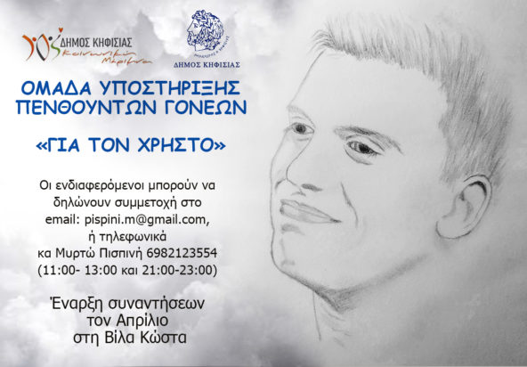 Η Κοινωνική Μέριμνα του Δήμου Κηφισιάς προχωρά στη δημιουργία ομάδας Υποστήριξης Πενθούντων Γονέων «Για τον Χρήστο» ‘έπειτα από πρόταση της κας Μυρτούς Πισπινή η οποία έχει βιώσει την απώλεια.