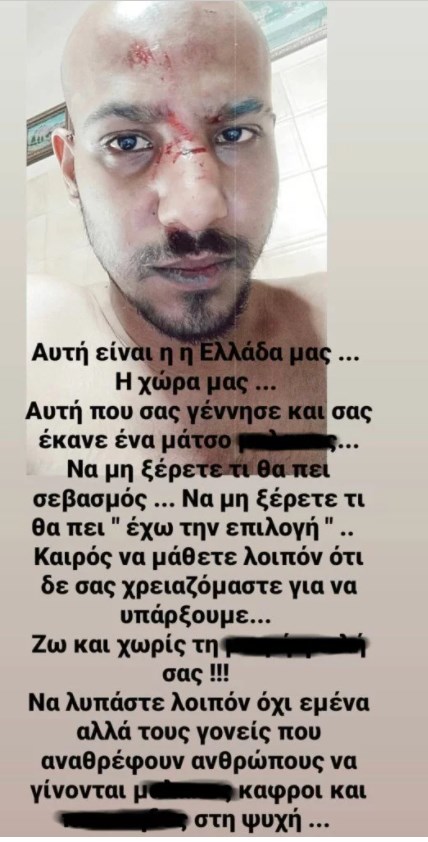 «Αυτή είναι η Ελλάδα μας… Η χώρα μας… Αυτή που σας γέννησε και σας έκανε ένα μάτσο μ…ες. Να μην ξέρετε τι θα πει σεβασμός… Να μην ξέρετε τι θα πει “έχω την επιλογή”… Καιρός να μάθετε λοιπόν ότι δεν σας χρειαζόμαστε για να υπάρξουμε (…) Να λυπάστε λοιπόν όχι για μένα αλλά για γονείς που αναθρέφουν ανθρώπους που γίνονται μ…ες, κάφροι» αναφέρει, μεταξύ άλλων, χαρακτηριστικά.