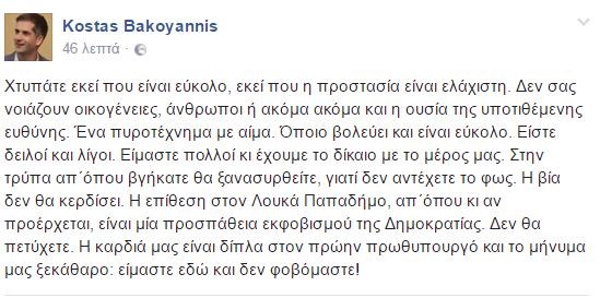 Μια οργισμένη ανάρτηση έκανε στο Facebook ο Περιφερειάρχης Στερεάς Ελλάδος Κώστας Μπακογιάννης, για την επίθεση κατά του Λουκά Παπαδήμου.“Χτυπάτε εκεί που είναι εύκολο, εκεί που η προστασία είναι ελάχιστη. Δεν σας νοιάζουν οικογένειες, άνθρωποι ή ακόμα ακόμα και η ουσία της υποτιθέμενης ευθύνης. Ένα πυροτέχνημα με αίμα. Όποιο βολεύει και είναι εύκολο. Είστε δειλοί και λίγοι. Είμαστε πολλοί κι έχουμε το δίκαιο με το μέρος μας. Στην τρύπα απ´όπου βγήκατε θα ξανασυρθείτε, γιατί δεν αντέχετε το φως. Η βία δεν θα κερδίσει. Η επίθεση στον Λουκά Παπαδήμο, απ´όπου κι αν προέρχεται, είναι μία προσπάθεια εκφοβισμού της Δημοκρατίας. Δεν θα πετύχετε. Η καρδιά μας είναι δίπλα στον πρώην πρωθυπουργό και το μήνυμα μας ξεκάθαρο: είμαστε εδώ και δεν φοβόμαστε!” έγραψε ο κ. Μπακογιάννης.