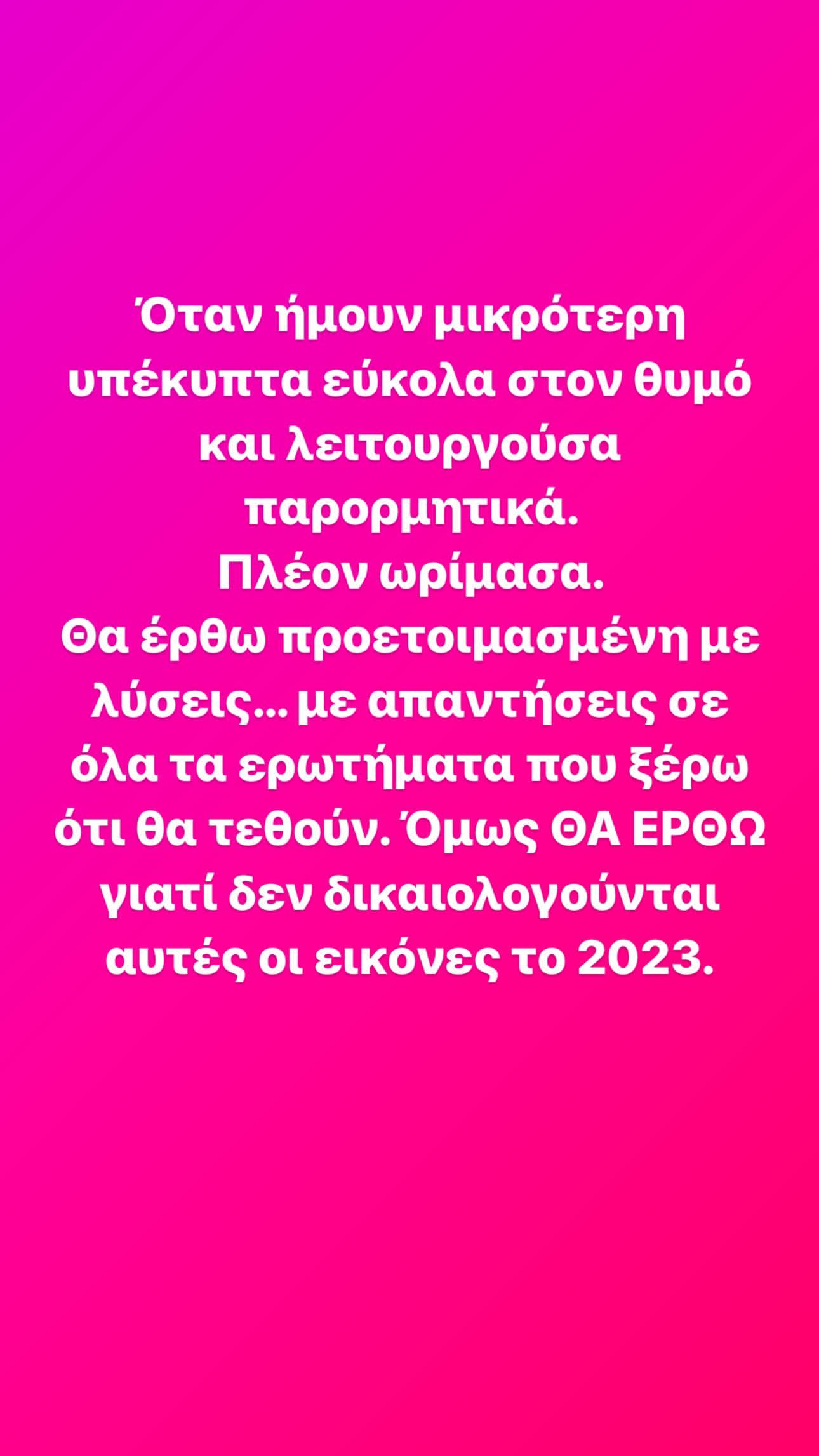 «Όταν ήμουν μικρότερη υπέκυπτα εύκολα στον θυμό και λειτουργούσα παρορμητικά. Πλέον ωρίμασα. Θα έρθω προετοιμασμένη με λύσεις… με απαντήσεις σε όλα τα ερωτήματα που ξέρω ότι θα τεθούν. Όμως ΘΑ ΕΡΘΩ γιατί δεν δικαιολογούνται αυτές οι εικόνες το 2023» έγραψε αρχικά, ενώ στην συνέχεια κοινοποίησε τις σοκαριστικές εικόνες.