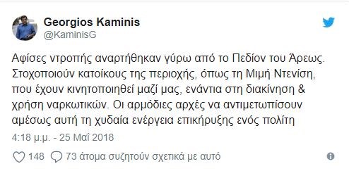 Την οργή του εξέφρασε μέσω Twitter ο δήμαρχος Αθηναίων, Γιώργος Καμίνης για τις αφίσες που αναρτήθηκαν γύρω από το Πεδίον του Άρεως και στοχοποιούν κατοίκους της περιοχής.