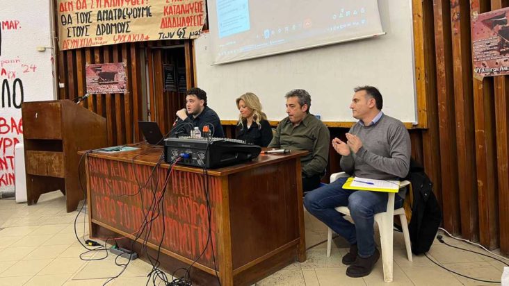 Σε συναισθηματικά φορτισμένο κλίμα πραγματοποιείται η εκδήλωση για τα Τέμπη στο Β’ Αμφιθέατρο της νέας Φιλοσοφικής Σχολής του Αριστοτελείου Πανεπιστημίου Θεσσαλονίκης, που διοργάνωσαν φοιτητές, με στόχο την ευαισθητοποίηση του κοινού.