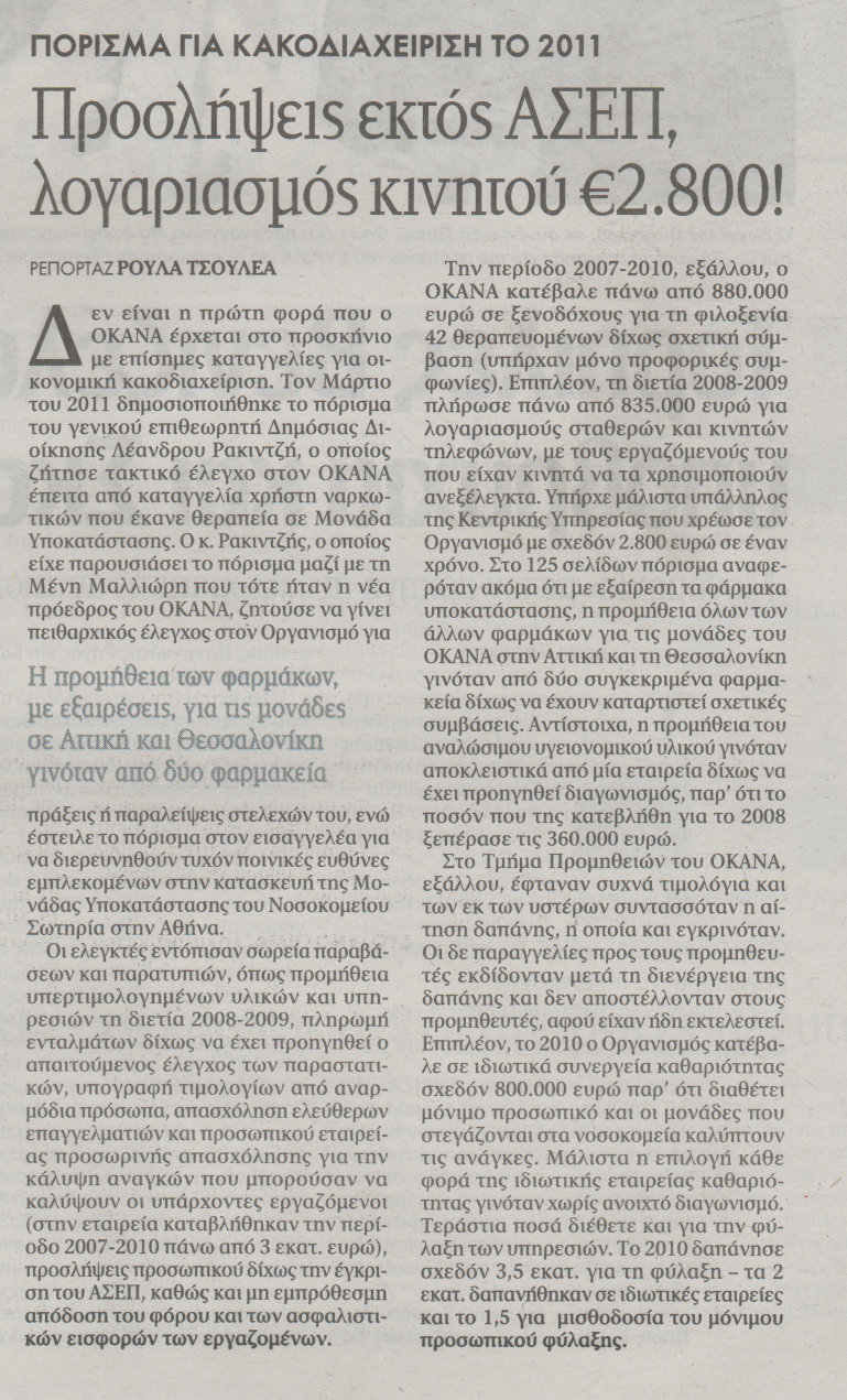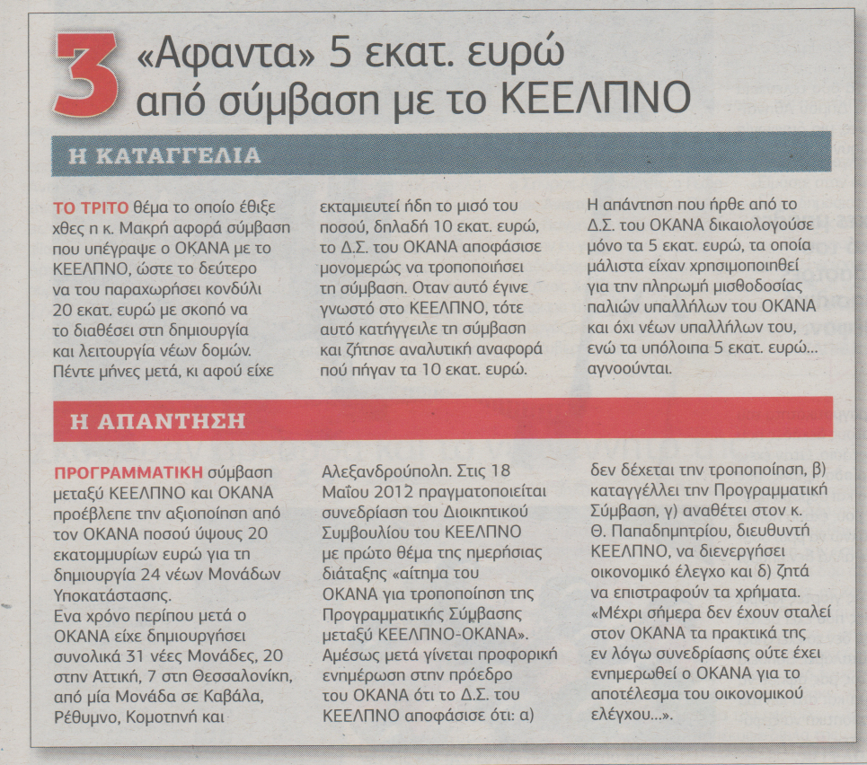 Ενδεικτικά, αναφέρουμε ότι την περίοδο 2007-2010, ο ΟΚΑΝΑ κατέβαλε πάνω από 880.000 ευρώ σε ξενοδόχους για τη φιλοξενία 42 θεραπευόμενων δίχως σχετική σύμβαση (υπήρχαν μόνο προφορικές συμφωνίες).