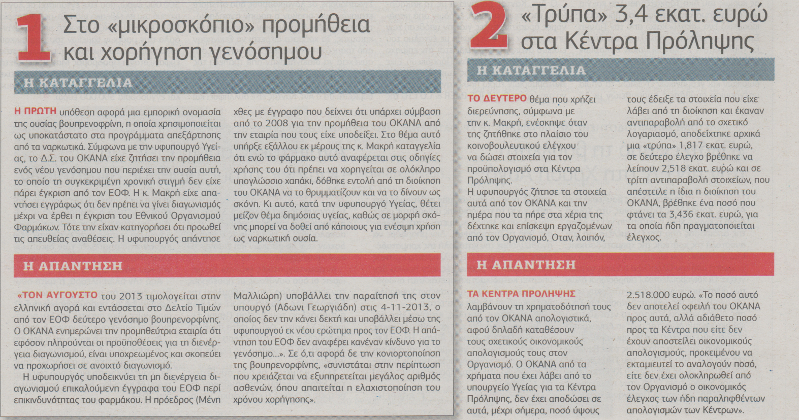 Για παράτυπη συμπεριφορά στον τρόπο προμήθειας και χορήγησης του φαρμάκου υποκατάστασης για άτομα που υποβάλλονται σε θεραπεία απεξάρτησης και δύο υποθέσεις που χρίζουν έρευνας από τον εισαγγελέα, το ΣΔΟΕ και τους ελεγκτές Δημόσιας Υγείας καθώς… αναζητούνται πάνω από 8 εκατ.ευρώ, κατηγορεί η υφυπουργός Υγείας, Ζέττα Μακρή, τη διοίκηση του Οργανισμού Κατά των Ναρκωτικών, με βασική υπεύθυνη την πρόεδρό του, καθηγήτρια Μένη Μαλλιώρη.