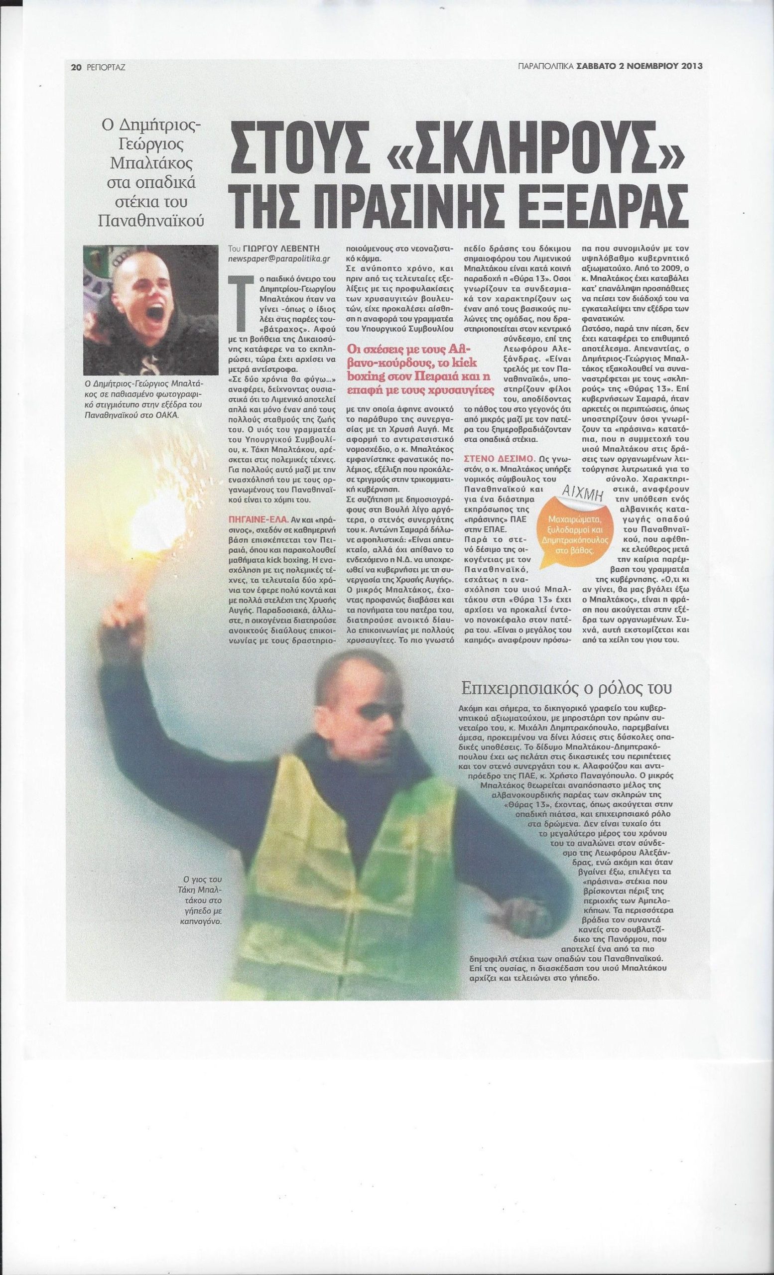 Η εφημερίδα “Παραπολιτικά” σε δημοσίευμα της, στις 2 Νοεμβρίου του 2013, αναφέρεται στην ενασχόλησή του γιου του Τάκη Μπαλτάκου με τους οργανωμένους του Παναθηναϊκού καθώς και στην παρουσία του σε οπαδικά στέκια.