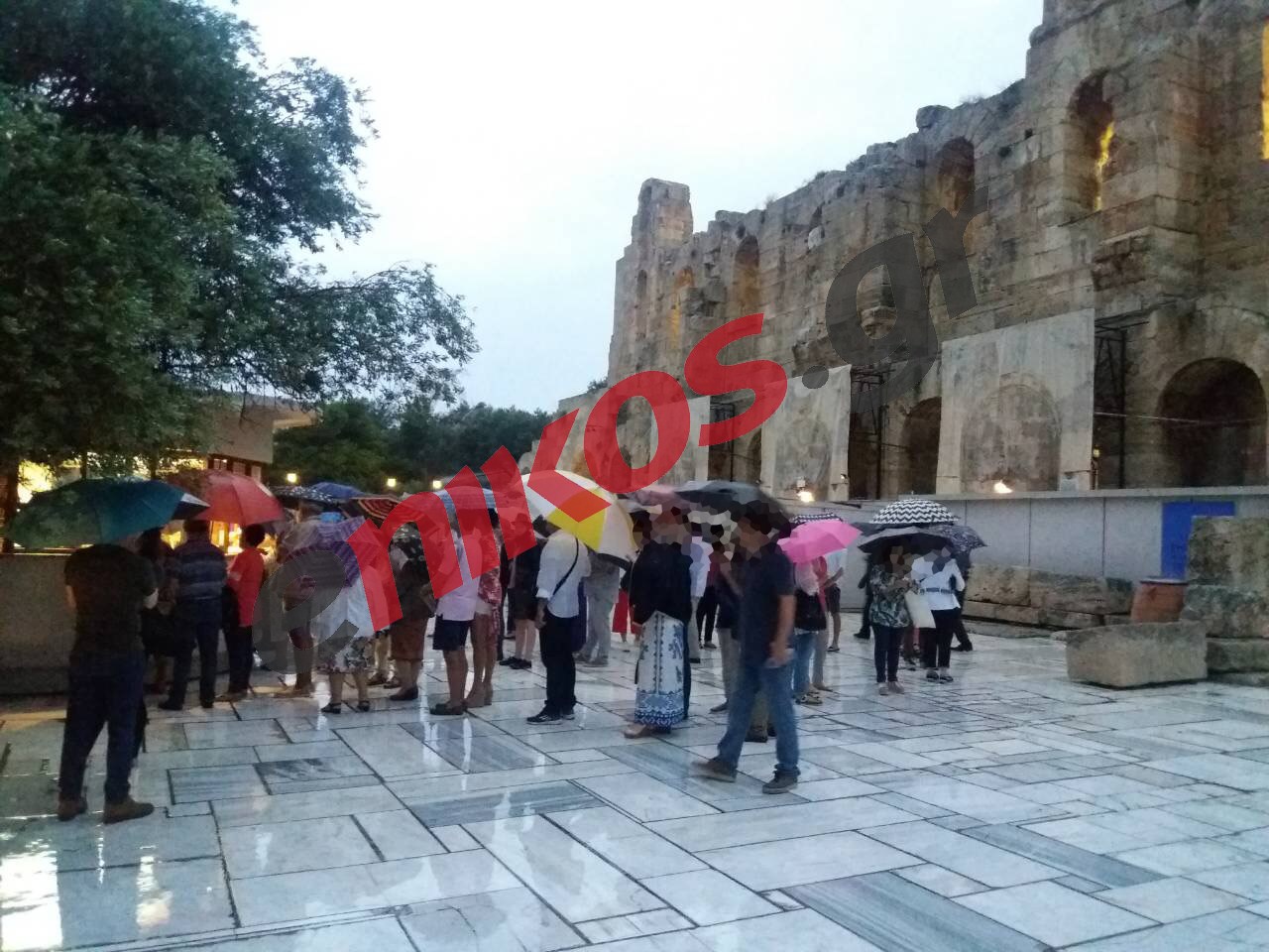 Όπως φαίνεται στη φωτογραφία αναγνώστη του enikos.gr, αρκετοί από τους θεατές κρατούσαν τις ομπρέλες τους, περιμένοντας ενημέρωση από τους υπεύθυνους.