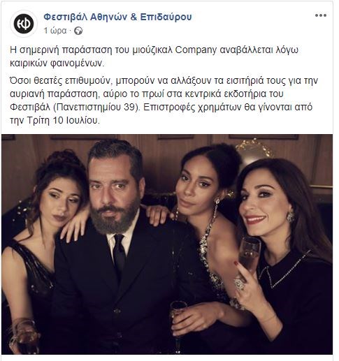 Πάντως σύγχυση προκαλεί το γεγονός ότι στη σελίδα του Φεστιβάλ Αθηνών και Επιδαύρου στο Facebook υπάρχει ανακοίνωση που μιλάει για αναβολή της παράστασης.
