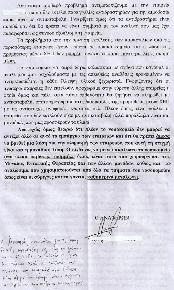 Ακόμη και χωρίς σύριγγες κινδυνεύει να μείνει το Σαββατοκύριακο το νοσοκομείο Ρόδου.Δεν πρόκειται για υπερβολή, αλλά για ένα εφιαλτικό ενδεχόμενο, στα πλαίσια των γενικότερων σοβαρών προβλημάτων που αντιμετωπίζει το νοσηλευτικό ίδρυμα, λόγω του εμπάργκο που κήρυξαν οι προμηθευτές του, επειδή είναι απλήρωτοι, και μάλιστα με σημαντικά ποσά, τα οποία δεν μπορούν να καλύπτουν, πλέον, οι ίδιοι, για να εφοδιάζουν το νοσοκομείο.Η προειδοποίηση ότι «πιθανόν το Σαββατοκύριακο να μην έχουμε ούτε σύριγγες» περιλαμβάνεται σε επιστολή της προϊσταμένης του χειρουργικού τομέα προς τη διοίκηση του νοσοκομείου με ημερομηνία 15 Ιουνίου 2012 και αναρτήθηκε χθες στην ιστοσελίδα της Ένωσης Νοσοκομειακών Ιατρών Ρόδου.Από το έγγραφο προκύπτει ότι το εμπάργκο οδηγεί το νοσοκομείο σε κατάσταση ασφυξίας, αφού οι προμηθεύτριες εταιρίες αρνούνται να παραδώσουν αναλώσιμα ιατρικά υλικά ακόμα και με αντικαταβολή, ζητώντας πρώτα εξόφληση των μέχρι τώρα οφειλομένων. Πηγή: rodosalarm.gr