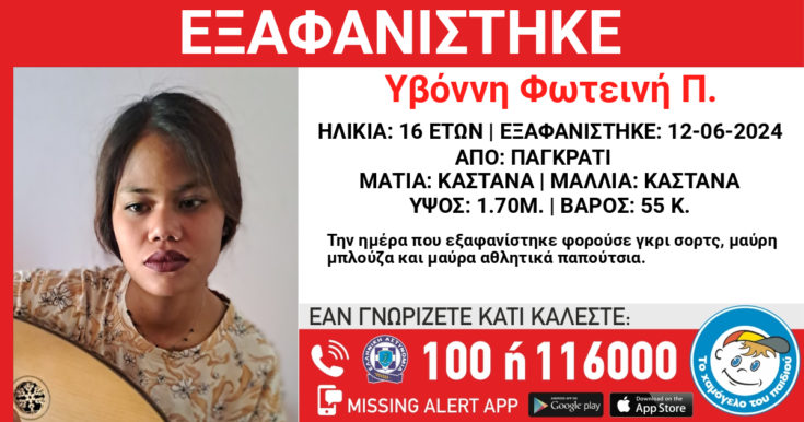 Τα ίχνη της Υβόννης Φωτεινής Π. χάθηκαν στις 12/06/2024 από το Παγκράτι. Το «Χαμόγελο του Παιδιού» ενημερώθηκε για την εξαφάνιση και προέβη στην ενεργοποίηση του μηχανισμού Missing Kid Alert, κατόπιν αιτήματος της οικογένειας της, καθώς ενδέχεται να συντρέχουν σοβαροί λόγοι που θέτουν τη ζωή της σε κίνδυνο.