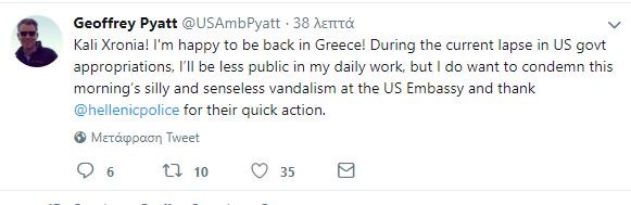 Ως ανόητη και παράλογη χαρακτηρίζει την επίθεση του Ρουβίκωνα στην αμερικανική πρεσβεία, ο Τζέφρυ Πάιατ. Ο Αμερικανός πρεσβευτής στην Αθήνα με ένα tweet, εύχεται αρχικά καλή χρονιά σε όλους και αμέσως μετά σχολιάζει την επίθεση της αναρχικής ομάδας με μπογιές σήμερα τα ξημερώματα.