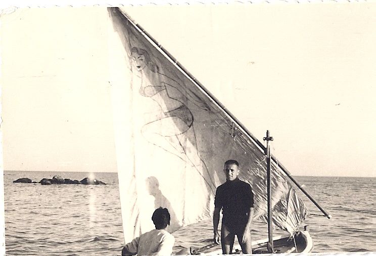 Λεζάντα: Οι Σαραφιανός-Τερζούδης στο βαρκάκι “Νιόβη” καλοκαίρι 1949. Πανέμορφη φωτογραφία και με μια απίστευτη λεπτομέρεια. Διακρίνεται στο πανί της βάρκας ενα PIN UP GIRL όπως αυτά που ζωγράφιζαν για καλή τύχη στα βομβαρδιστικά τους οι Σύμμαχοι στον 2ο Παγκόσμιο Πόλεμο.. Ο κος Σαραφιανός γράφει ο ίδιος πίσω από την φωτογραφία: “Pin up girl για να πηγαίνει πιο γρήγορα”! (φωτογραφία του γιατρού κου Βασίλη Σαραφιανού) – από την σελίδα «Γειτονιές και Αναμνήσεις της Αλεξανδρούπολης (που αλλάζει..)» στο Facebook