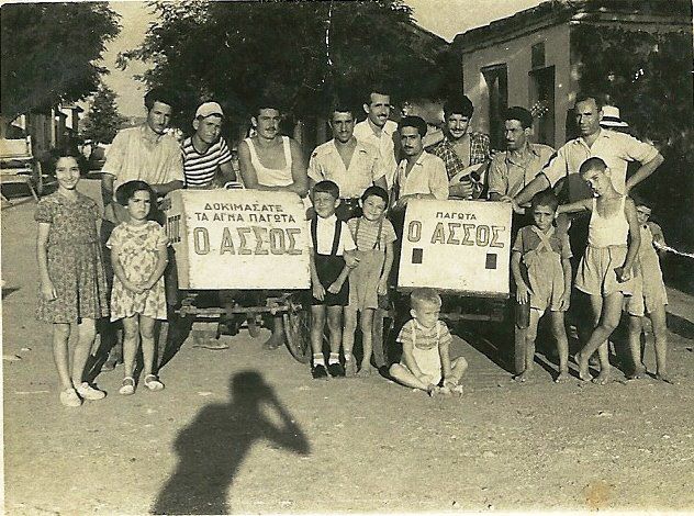 Λεζάντα: Καλοκαίρι στην Απολλωνιάδα (Αλεξανδρούπολη) 1950. Όλη η γειτονιά φωτογραφίζεται γύρω από τον Παγωτατζή κυρ Χρήστο με τα περίφημα παγωτά “ΑΣΣΟΣ” (φωτογραφία Ν. Θεοδωρίδη) – από την σελίδα «Γειτονιές και Αναμνήσεις της Αλεξανδρούπολης (που αλλάζει..)» στο Facebook