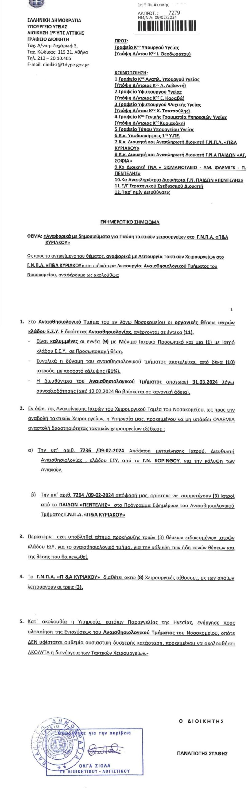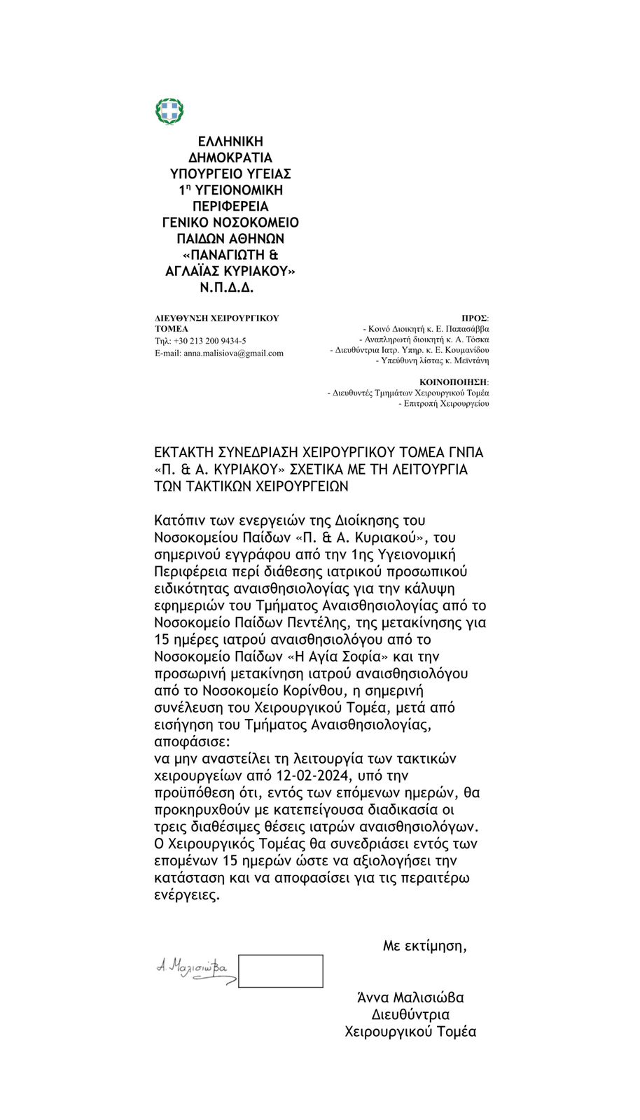 Συγκεκριμένα, σε έκτακτη συνεδρίαση του χειρουργικού τομέα του Γενικού Νοσοκομείου Παίδων «Αγλαΐα Κυριακού» αποφασίστηκε να μην ανασταλούν από 12-02-2024, τα τακτικά χειρουργεία αλλά να γίνει επανεξέταση σε 15 ημέρες με προσωρινή λύση τη μετακίνηση αναισθησιολόγων.