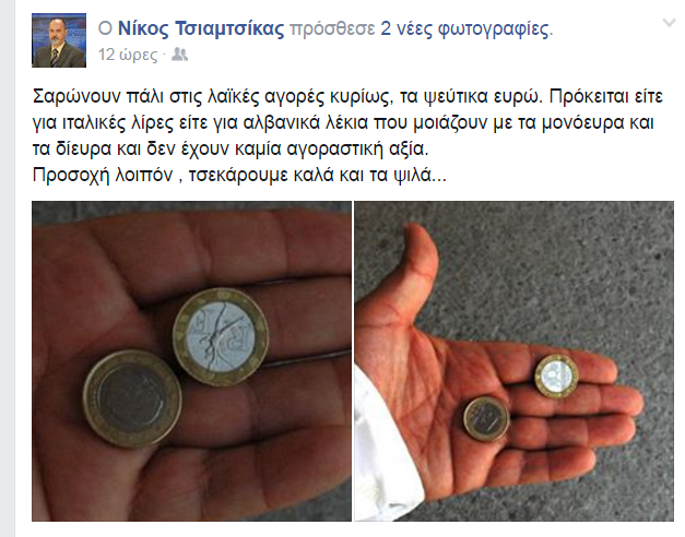 Σε ευρεία κλίμακα “κυκλοφορούν” στις λαϊκές αγορές ψεύτικα κέρματα, κυρίως του ενός ή των δύο ευρώ, όπως καταγγέλλει ο δημοσιογράφος Νίκος Τσιαμτσίκας μέσω του προσωπικού του προφίλ στο facebook.
