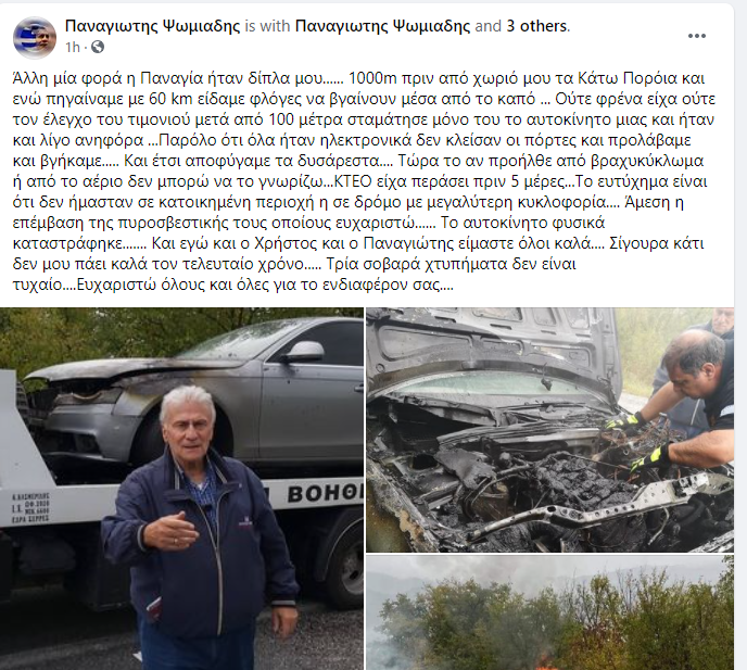 “Άλλη μία φορά η Παναγία ήταν δίπλα μου… 1000m πριν από χωριό μου τα Κάτω Πορόια και ενώ πηγαίναμε με 60 km είδαμε φλόγες να βγαίνουν μέσα από το καπό… Ούτε φρένα είχα ούτε τον έλεγχο του τιμονιού μετά από 100 μέτρα σταμάτησε μόνο του το αυτοκίνητο μιας και ήταν και λίγο ανηφόρα” αναφέρει στην ανάρτηση ο Παναγιώτης Ψωμιάδης, ο οποίος δημοσίευσε και αρκετές φωτογραφίες.