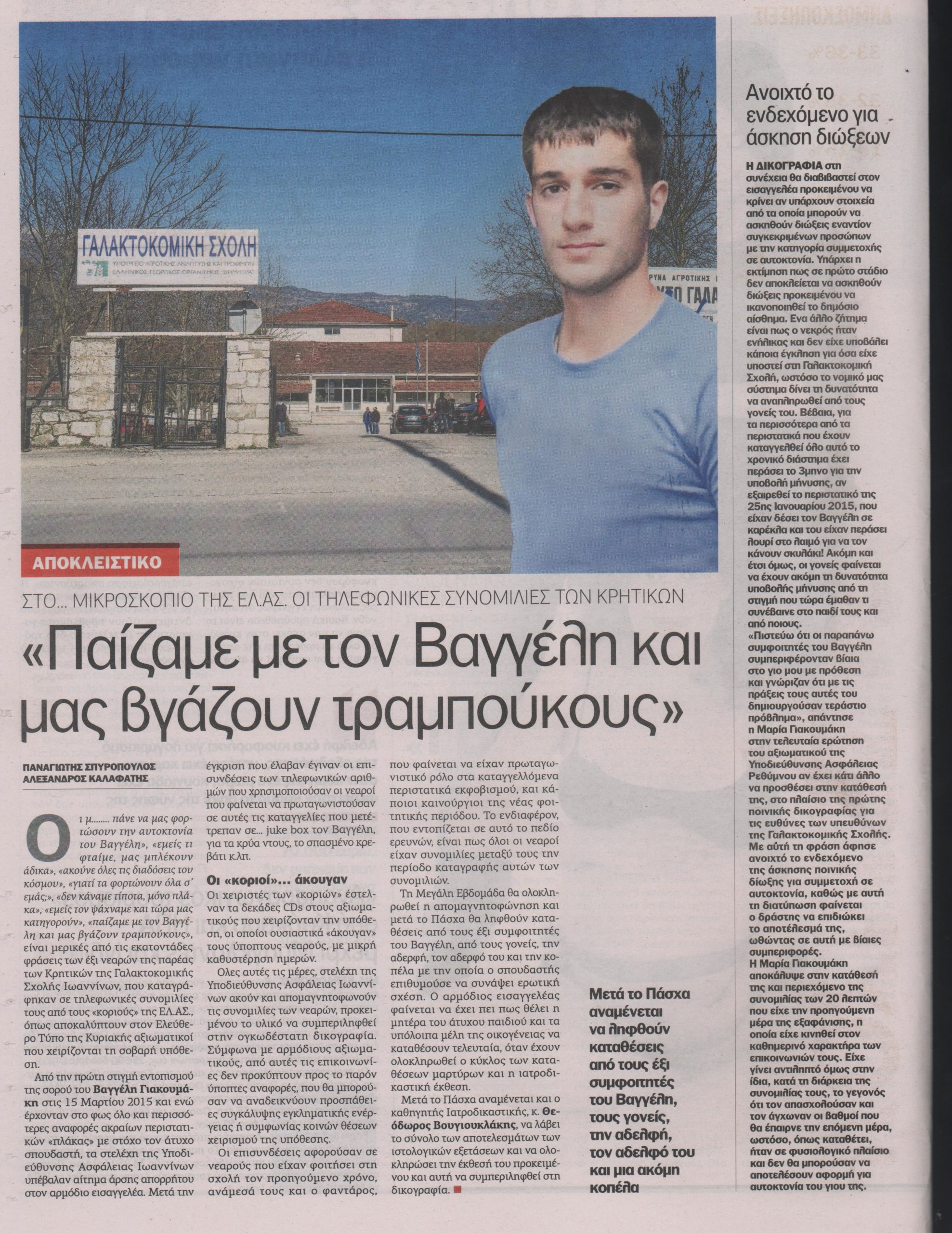 «Οι μ… πάνε να μας φορτώσουν την αυτοκτονία του Βαγγέλη», «εμείς τι φταίμε, μας μπλέκουν άδικα», «ακούνε όλες τις διαδόσεις του κόσμου», «γιατί τα φορτώνουν όλα σ’ εμάς;», «δεν κάναμε τίποτα, μόνο πλάκα», «εμείς τον ψάχναμε και τώρα μας κατηγορούν», «παίζαμε με τον Βαγγέλη και μας βγάζουν τραμπούκους», είναι μερικές από τις εκατοντάδες φράσεις των έξι νεαρών της παρέας των Κρητικών της Γαλακτοκομικής Σχολής Ιωαννίνων, που καταγράφηκαν σε τηλεφωνικές συνομιλίες τους από τους «κοριούς» της ΕΛ.ΑΣ., όπως αποκαλύπτουν στον Ελεύθερο Τύπο της Κυριακής αξιωματικοί που χειρίζονται την υπόθεση.
