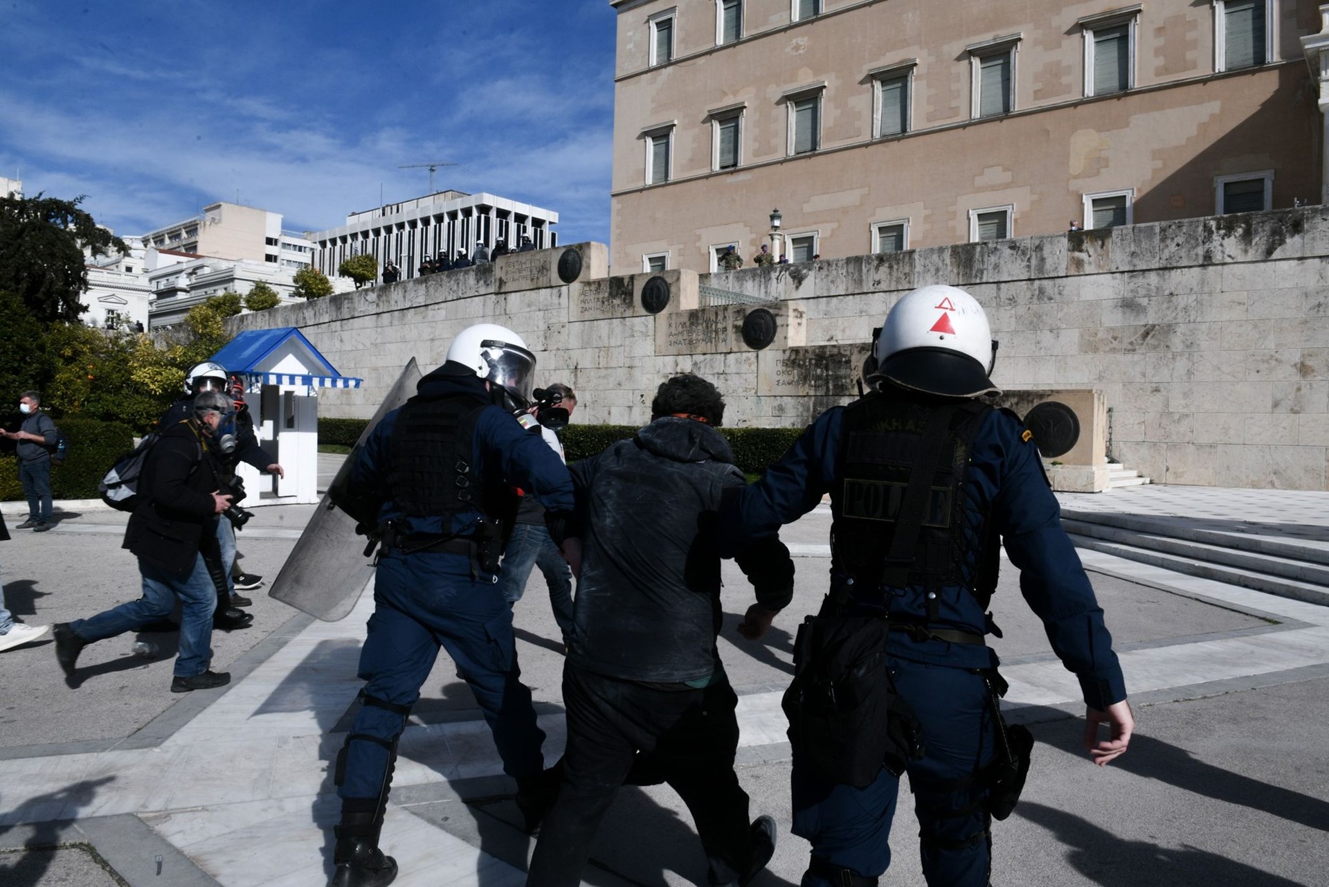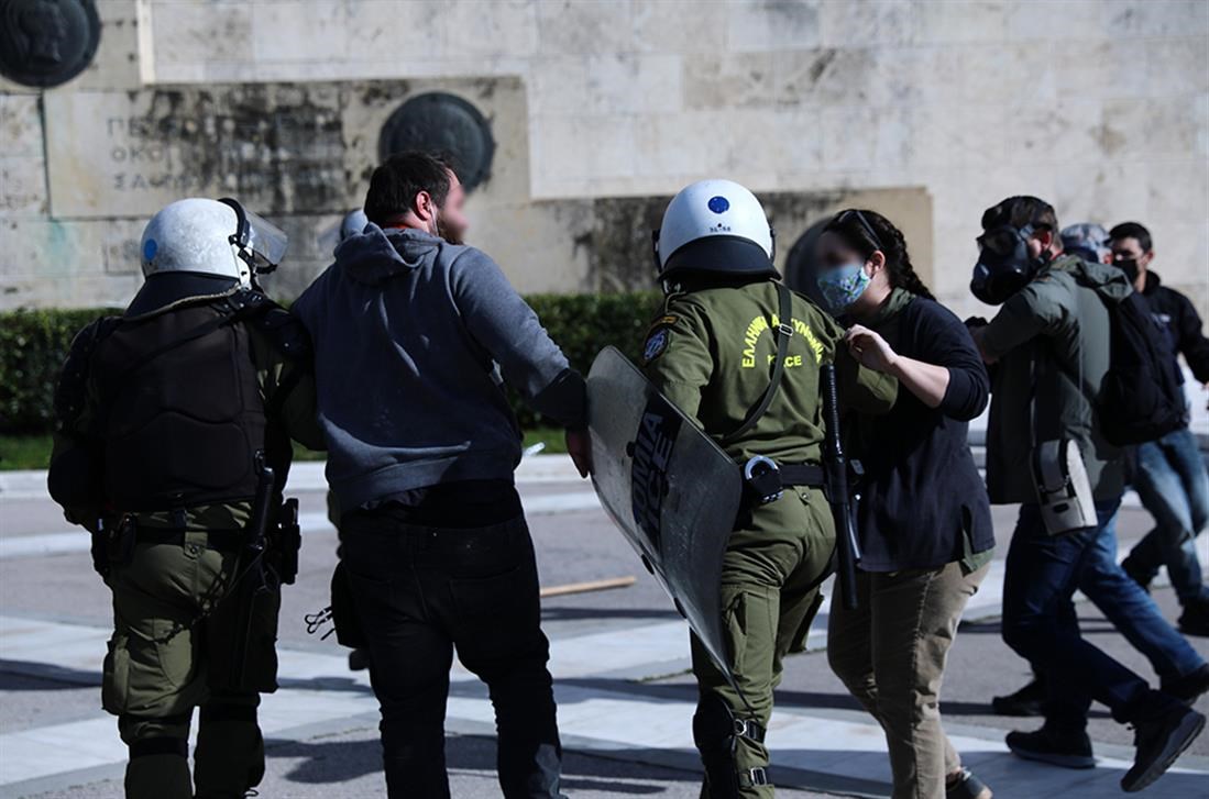 Αρχικά, ένταση προκλήθηκε μπροστά από τη Βουλή, στο Σύνταγμα, όταν φοιτητές συγκρούστηκαν με τις αστυνομικές δυνάμεις, που είχαν παραταχθεί μπροστά από το μνημείο του Άγνωστου Στρατιώτη. Πληροφορίες αναφέρουν πως οι διαδηλωτές επιχείρησαν να σπάσουν τον φραγμό, με τους αστυνομικούς να τους απωθούν κάνοντας χρήση χημικών. Ακολούθησαν μάχες σώμα με σώμα, ενώ οι αστυνομικές δυνάμεις προχώρησαν σε προσαγωγές.