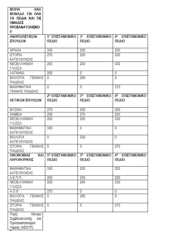 – 200 μόρια για κάθε μονάδα των υπολοίπων μαθημάτων
