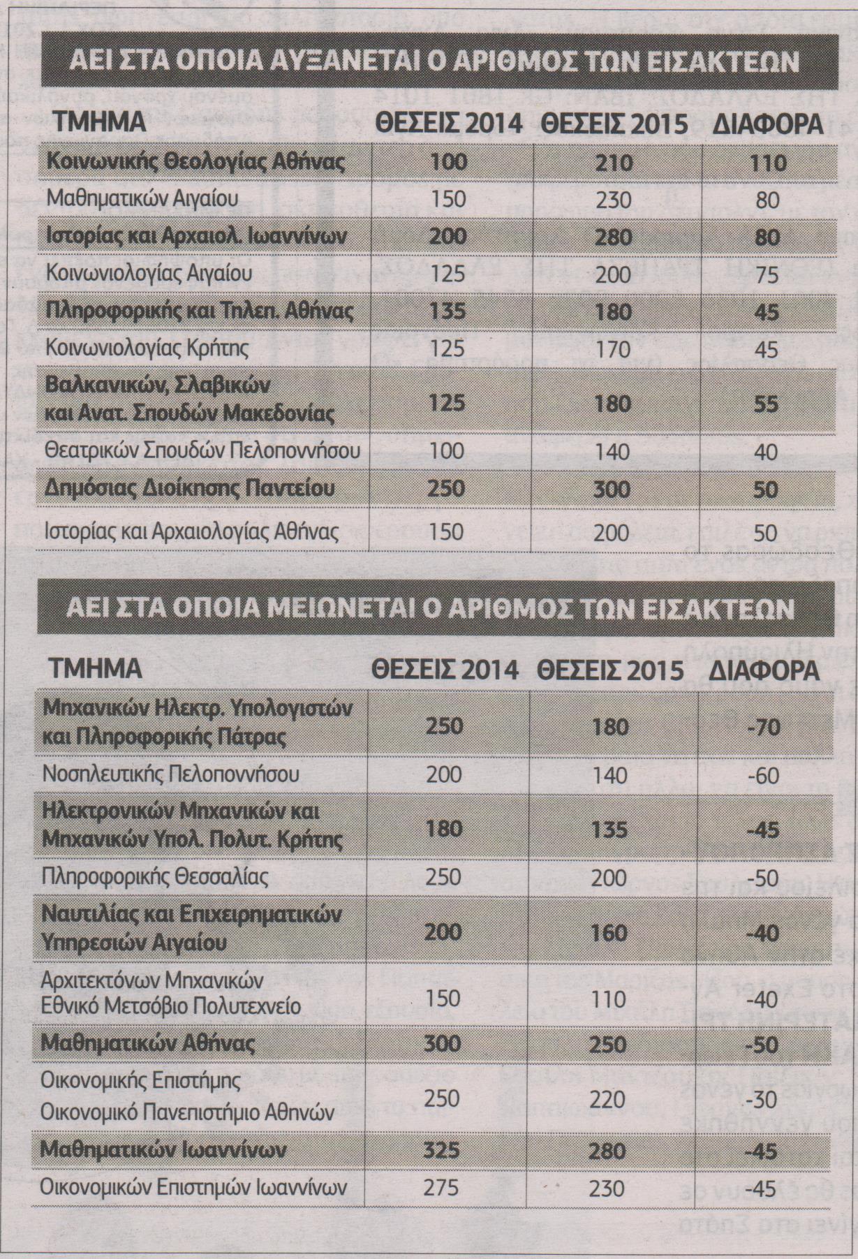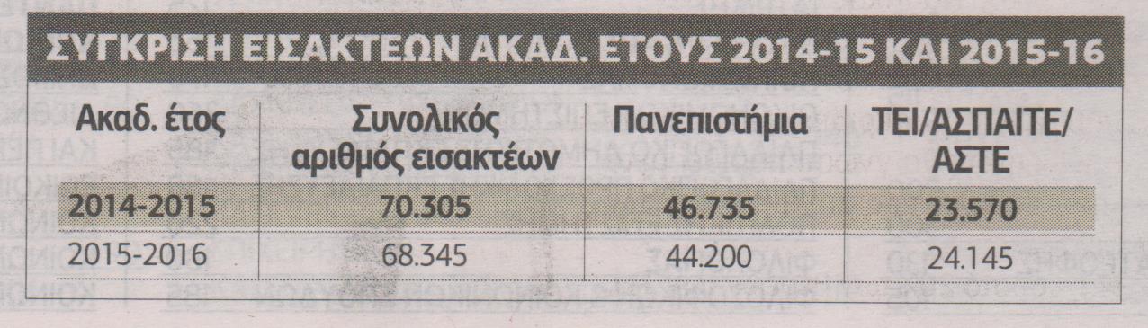 Φέτος ο συνολικός αριθμός των εισακτέων στα ανώτατα εκπαιδευτικά ιδρύματα μειώθηκε κατά΄1.960 θέσεις και θα εισαχθούν στα ΑΕΙ 68.345 υποψήφιοι ενώ πέρυσι είχαν εισαχθεί 70.305.