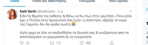 “Είδα τα θέματα της έκθεσης & θέλω να πω πως στην ερώτηση «Ποιο ρόλο έχει η Ποίηση στην προσωπική σας ζωή;» η απάντηση «έβραζε το κύμα της Γαρμπή» δεν θα κριθεί σωστή. Καλή αρχή σε όλα τα παιδιά!Βάλτε τα δυνατά σας & ανεξάρτητα από τα αποτελέσματα να χαμογελάτε & να ονειρεύεστε”.