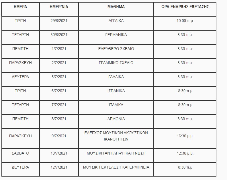 – για το μουσικό μάθημα «Μουσική Αντίληψη και Γνώση», η εξέταση στο αντικείμενο της Μουσικής Αντίληψης έχει διάρκεια 30′ λεπτών, ενώ η εξέταση στο αντικείμενο της Μουσικής Γνώσης έχει διάρκεια 2 ωρών.