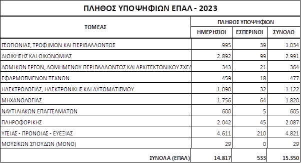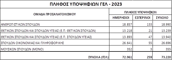 Επισημαίνεται ότι το πλήθος των υποψηφίων ΓΕΛ/ΕΠΑΛ προκύπτει από τη συμμετοχή σε τουλάχιστον δύο πανελλαδικώς εξεταζόμενα μαθήματα (εκτός των Μουσικών Σπουδών).