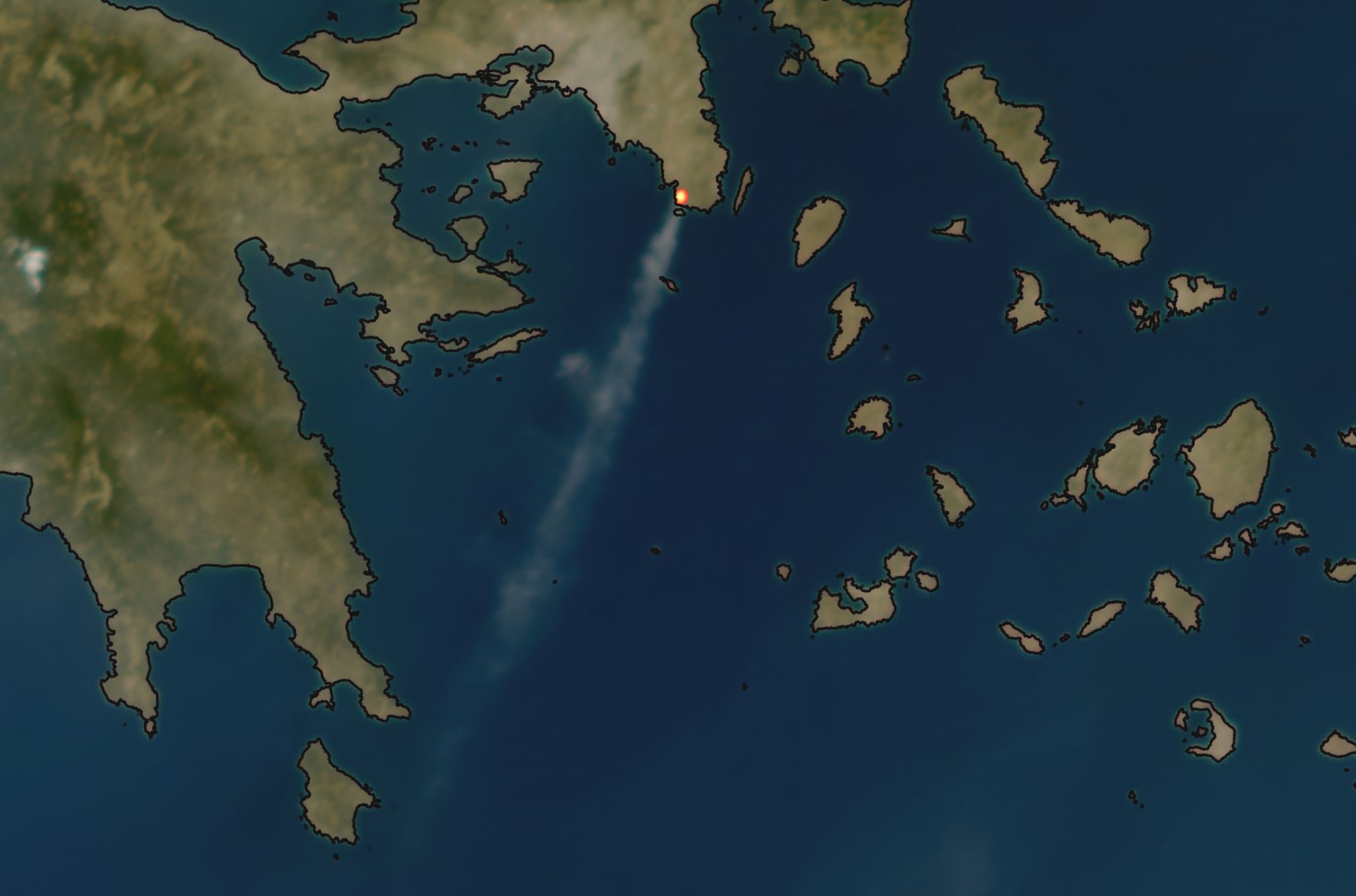 Η πυρκαγιά είναι “ορατή” και από τον γεωστατικό δορυφόρο Meteosat-12, με τον καπνό να έχει μεταφερθεί σε απόσταση περίπου 180 km νοτιοδυτικά και να εντοπίζεται πάνω από τη θαλάσσια περιοχή των Κυθήρων, όπως χαρακτηριστικά αποτυπώνεται στην επόμενη εικόνα.
