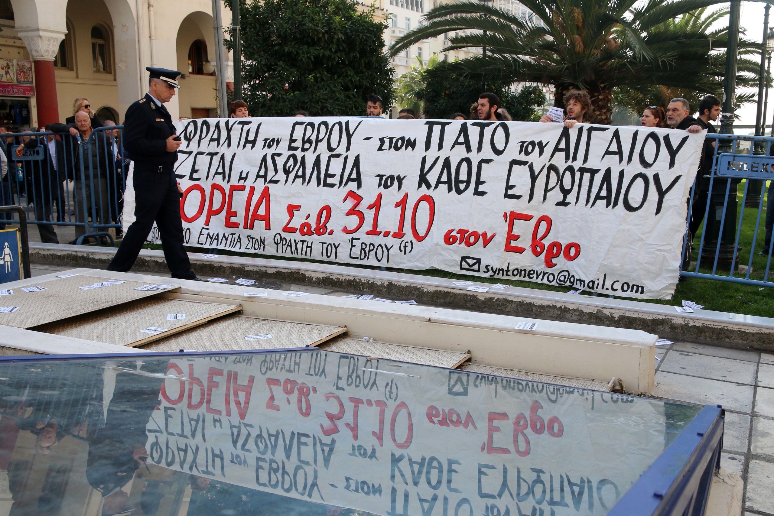 Ένα πανό – διαμαρτυρίας για τον φράχτη στον Έβρο σήκωσε ομάδα ατόμων στην μαθητική παρέλαση της Θεσσαλονίκης, στο πλαίσιο των εκδηλώσεων της Επετείου της απελευθέρωσης της πόλης και της 28ης Οκτωβρίου, στην οδό Τσιμισκή.