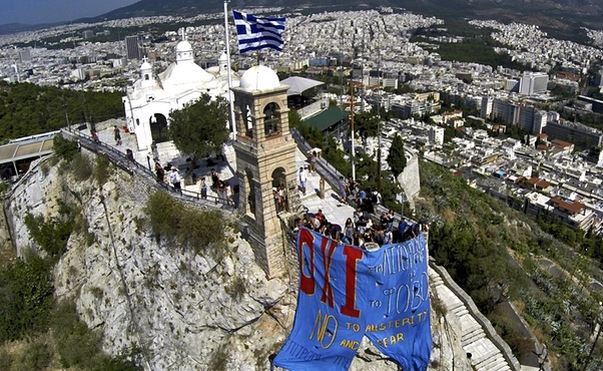 Ένα τεράστιο πανό ανήρτησαν πολίτες που υποστηρίζουν το “ΟΧΙ” στο δημοψήφισμα στο Λυκαβηττό. Στο πανό αναγράφεται «ΟΧΙ στη λιτότητα. ΟΧΙ στο φόβο».