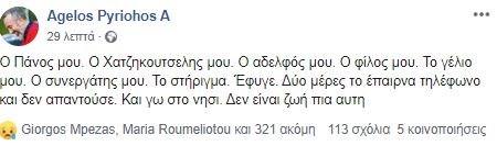 Υπενθυμίζεται ότι την είδηση του θανάτου του σπουδαίου ηθοποιού γνωστοποίησε μέσα από τα social media το πρωί της Παρασκευής ο καλός του φίλος Άγγελος Πυριόχος. «Ο Πάνος μου. Ο Χατζηκουτσέλης μου. Ο αδελφός μου. Ο φίλος μου. Το γέλιο μου. Ο συνεργάτης μου. Το στήριγμα. Έφυγε. Δύο μέρες το έπαιρνα τηλέφωνο και δεν απαντούσε. Και ‘γω στο νησί. Δεν είναι ζωή πια αυτή», έγραψε χαρακτηριστικά στον προσωπικό του λογαριασμό στο facebook ο Άγγελος Πυριόχος.