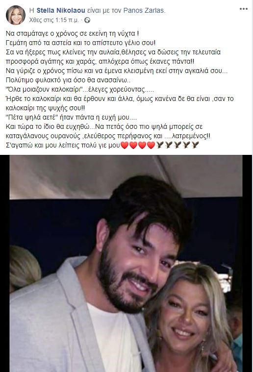 “Να σταμάταγε ο χρόνος σε εκείνη τη νύχτα ! Γεμάτη από τα αστεία και το απίστευτο γέλιο σου! Σα να ήξερες πως κλείνεις την αυλαία, θέλησες να δώσεις την τελευταία προσφορά αγάπης και χαράς, απλόχερα όπως έκανες πάντα!! Να γύριζε ο χρόνος πίσω και να έμενα κλεισμένη εκεί στην αγκαλιά σου… Πολύτιμο φυλακτό για όσο θα ανασαίνω.. ‘Όλα μοιάζουν καλοκαίρι’…έλεγες χορεύοντας… Ήρθε το καλοκαίρι και θα έρθουν και άλλα, όμως κανένα δεν θα είναι ,σαν το καλοκαίρι της ψυχής σου!! ‘Πέτα ψηλά αετέ’ ήταν πάντα η ευχή μου… Και τώρα το ίδιο θα ευχηθώ…Να πετάς όσο πιο ψηλά μπορείς σε καταγάλανους ουρανούς ,ελεύθερος περήφανος και ….λατρεμένος!! Σ’αγαπώ και μου λείπεις πολύ γιε μου”, έγραψε η Στέλλα Νικολαόυ.