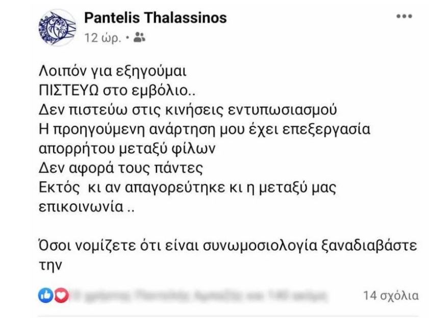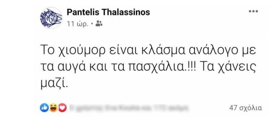 Η ανάρτηση αυτή προκάλεσε σάλο στα social media και μετά λίγο εξαφανίστηκε από τον “τοίχο” του Παντελή Θαλασσινού. Εκείνος απαντώντας σε σχόλιο χρήστη του Facebook υποστήριξε ότι δεν κατέβασε την ανάρτηση, αλλά από δημόσια την έκανε να τη βλέπουν μόνο οι διαδικτυακοί του φίλοι.