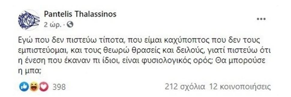 Θύελλα αντιδράσεων στα social media προκάλεσε η ανάρτηση του Παντελή Θαλασσινού σχετικά με τα εμβόλια. Συγκεκριμένα ο γνωστός τραγουδοποιός έγραψε: “Εγώ που δεν πιστεύω τίποτα, που είμαι καχύποπτος, που δεν τους εμπιστεύομαι και τους θεωρώ θρασείς και δειλούς, γιατί πιστεύω ότι η ένεση που έκαναν οι ίδιοι είναι φυσιολογικός ορός; Θα μπορούσε ή μπα;”.