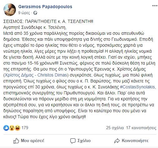 Μετά από 35 χρόνια παράλληλης πορείας δικαιούμαι να σου απευθυνθώ δημόσια. Έθεσες και πάλι υποψηφιότητα για δ/ντής στο Γεωδυναμικό. Επειδή έχεις υπερβεί το όριο ηλικίας που θέτει ο νόμος, προσκόμισες χαρτιά για νεώτερη ηλικία, λίγες μέρες πριν λήξει η προθεσμία! Η αλλαγή ηλικίας νομικά δε γίνεται δεκτή. Αλλά ούτε με την κοινή λογική στέκει. Γιατί αν ισχύει, μπήκες στο παν/μιο 15-16 χρόνων!!! Συνεπώς, φέρνεις σε πολύ δύσκολη θέση τα μέλη της επιτροπής. Θα μου πεις ότι ο Υφυπουργός Έρευνας κ. Χρίστος Δήμας (Χρίστος Δήμας – Christos Dimas) συγκρότησε, όλως τυχαίως, μια πολύ φιλική επιτροπή. Όλως τυχαίως ο φίλος σου ο κ. Π. Βαρώτσος, που μαζί κάνετε τις προγνώσεις επί 30 χρόνια, όλως τυχαίως ο κ. Κ. Συνολάκης #CostasSynolakis, επιστημονικός συνεργάτης του Πρωθυπουργού. Και άλλοι. Παρ’ όλα αυτά δυσκολεύονται να πάρουν μερίδιο στη μη νομιμότητα. Για να κρατήσεις την αξιοπρέπειά σου, για να κρατήσουν και οι άλλοι τη δική τους, σε προτρέπω να δηλώσεις παραίτηση από υποψήφιος. Είναι το καλύτερο που σου μένει να κάνεις! Τώρα που έχεις λίγο χρόνο ακόμη!!”