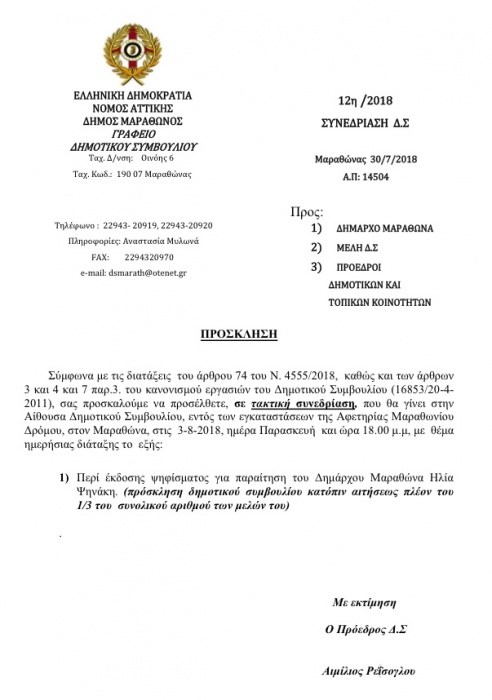 Την έκδοση ψηφίσματος που θα ζητά την παραίτηση του δημάρχου Μαραθώνα Ηλία Ψινάκη ζητούν με αίτημά τους προς τον Πρόεδρο του Δημοτικού Συμβουλίου 23 από τους 30 δημοτικούς συμβούλους.