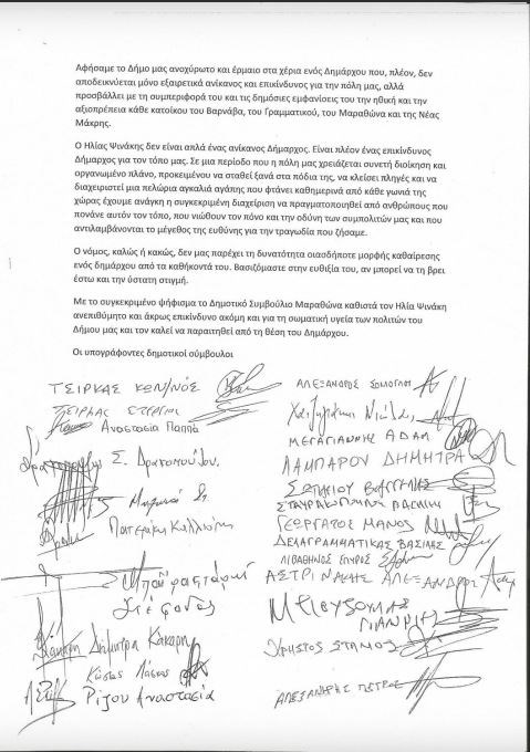 “Αφήσαμε το Δήμο μας ανοχύρωτο και έρμαιο στα χέρια ενός Δημάρχου που, πλέον, δεν αποδεικνύεται μόνο εξαιρετικά ανίκανος και επικίνδυνος για την πόλη μας, αλλά προσβάλλει με τη συμπεριφορά του και τις δημόσιες εμφανίσεις του την ηθική και την αξιοπρέπεια κάθε κατοίκου του Βαρνάβα, του Γραμματικού, του Μαραθώνα και της Νέας Μάκρης. Ο Ηλίας Ψινάκης δεν είναι απλά ένας ανίκανος Δήμαρχος. Είναι πλέον ένας επικίνδυνος Δήμαρχος για τον τόπο μας” αναφέρουν μεταξύ άλλων οι υπογράφοντες δημοτικοί σύμβουλοι που ζητούν την άμεση συνεδρίαση του δημοτικού συμβουλίου για το συγκεκριμένο θέμα.