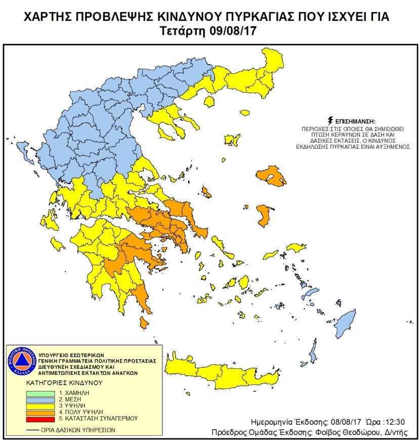Για σήμερα, Τετάρτη 9 Αυγούστου, προβλέπεται πολύ υψηλός κίνδυνος (κατηγορία κινδύνου 4) για τις εξής περιοχές: Περιφέρεια Αττικής, Στερεάς Ελλάδας (Βοιωτία, Εύβοια), Πελοποννήσου (Κορινθία, Αργολίδα Αρκαδία, Λακωνία) και Βορείου Αιγαίου (Λέσβος, Χίος).