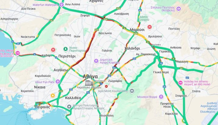 Στο «κόκκινο» βρίσκεται ο Κηφισός, αλλά και η άνοδος και η κάθοδος της Λεωφόρου Κηφισίας. Χαμηλές ταχύτητες παρατηρούνται στην Μεσογείων, την Βασιλέως Κωνσταντίνου και στους δρόμους γύρω από το λιμάνι του Πειραιά.