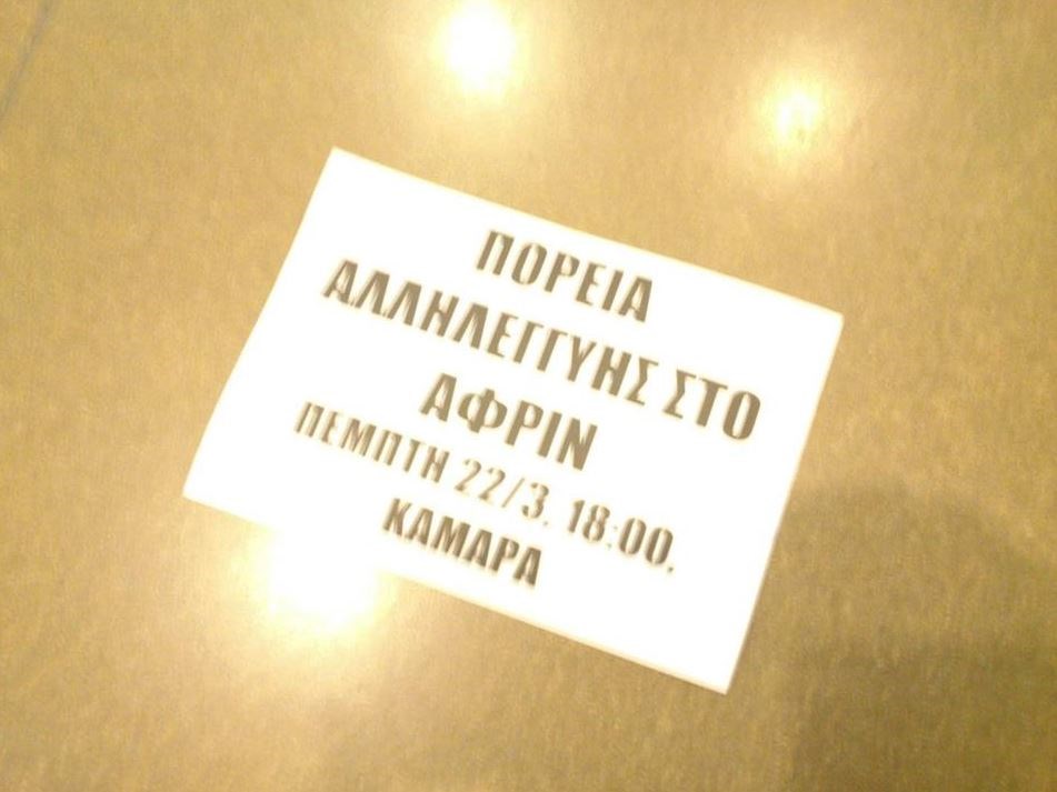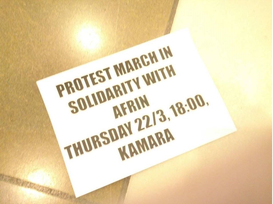 Σύμφωνα με την αστυνομία, ομάδα ατόμων άνοιξε, μπροστά από τα γκισέ, πανό όπου αναγράφονταν “Defend Afrin” και πέταξε τρικάκια καλώντας σε “συγκέντρωση και πορεία αλληλεγγύης στο αντιστεκόμενο Αφρίν την Πέμπτη 22 Μαρτίου, στις 6 το απόγευμα, στην Καμάρα”.