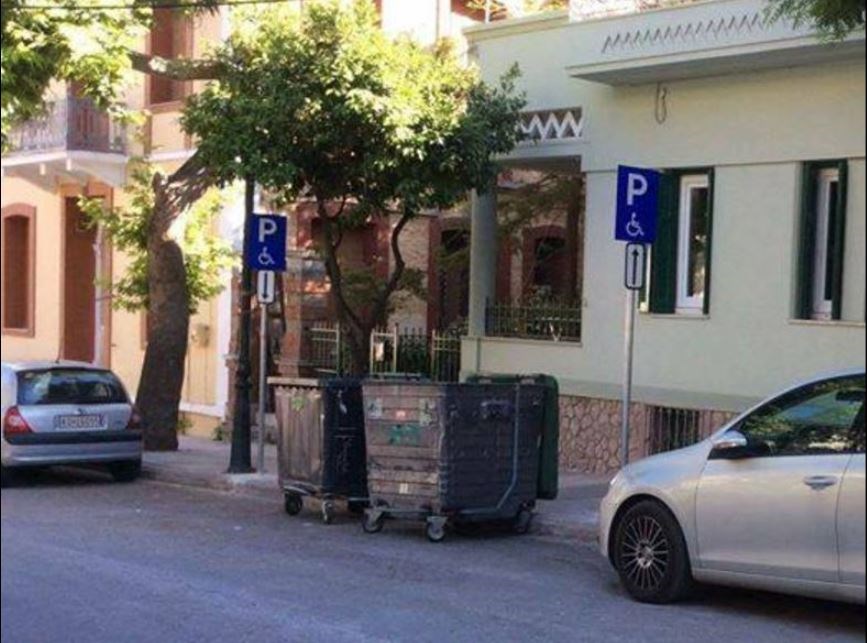 Σε φωτογραφία που ανέβασε στην προσωπική του σελίδα στο facebook ο δημοσιογράφος του “Αλήθεια TV”, Μανωλης Βερβεράκης, φαίνεται μια θέση στάθμευσης ατόμου με κινητικά προβλήματα να έχει καταληφθεί από κάδους απορριμμάτων.